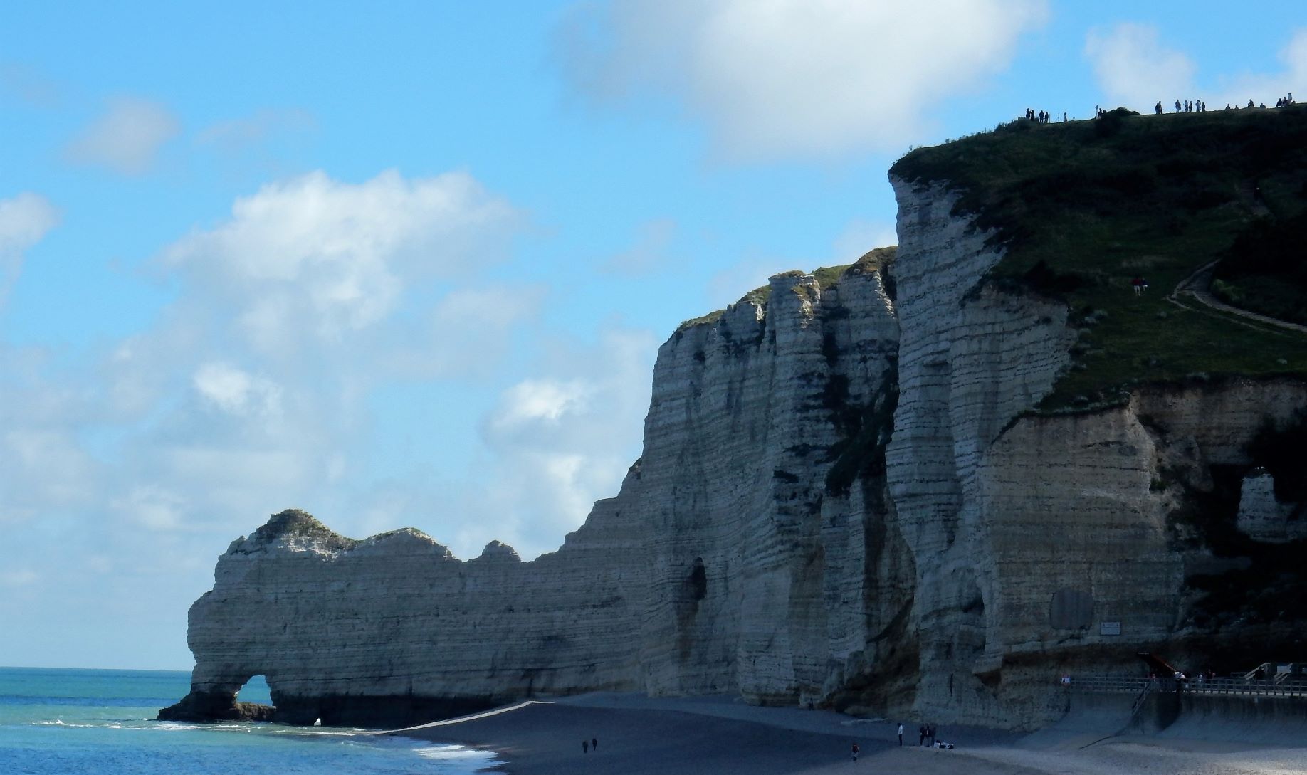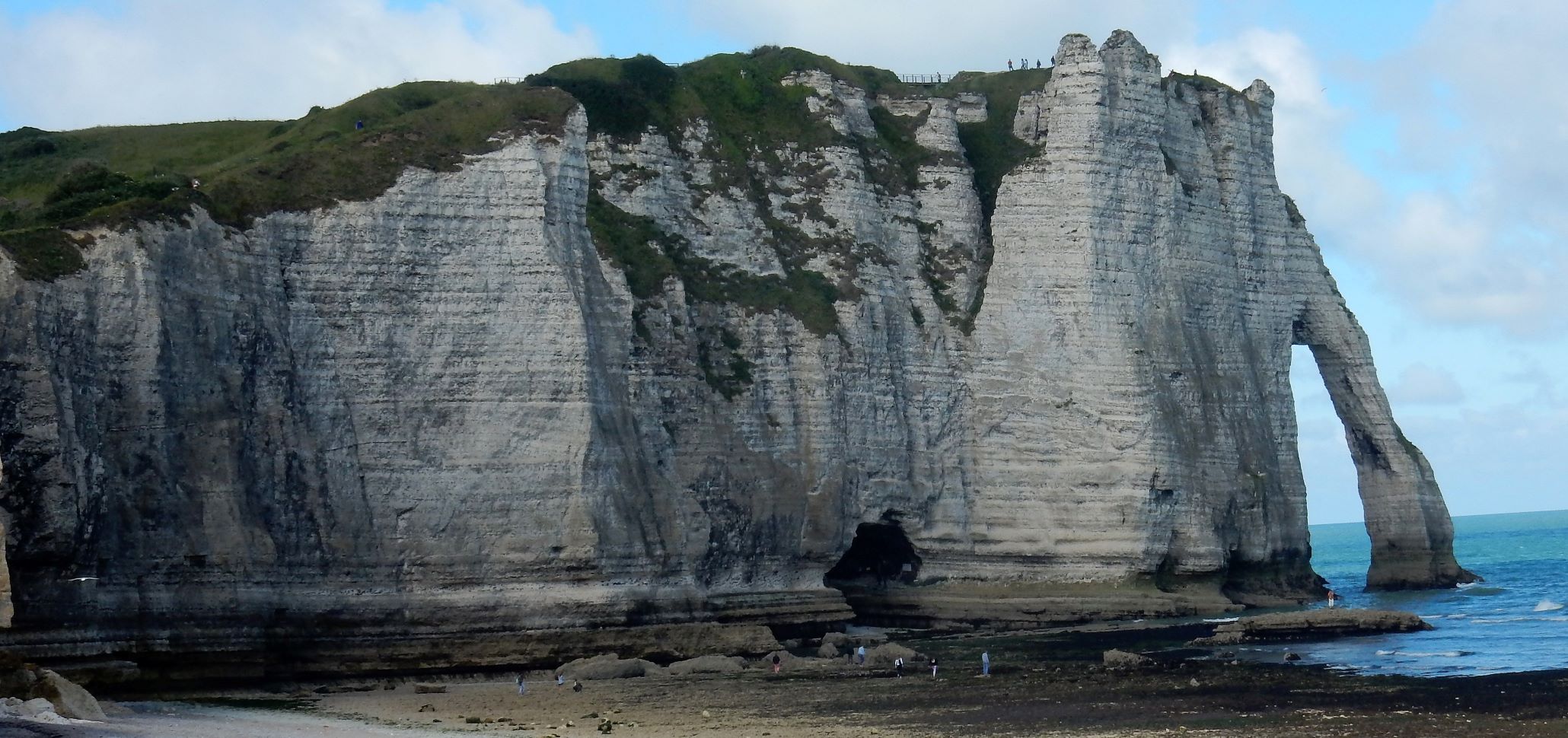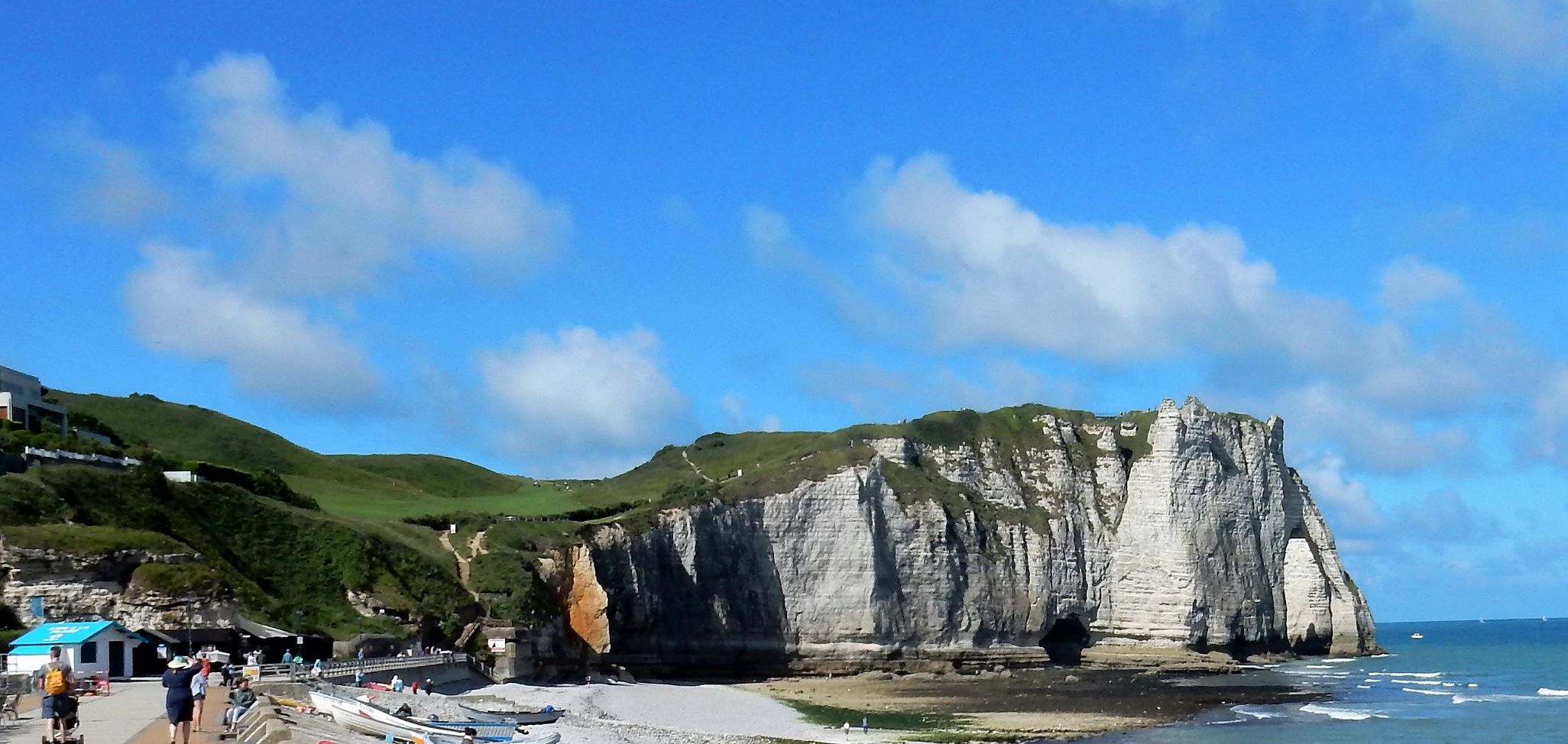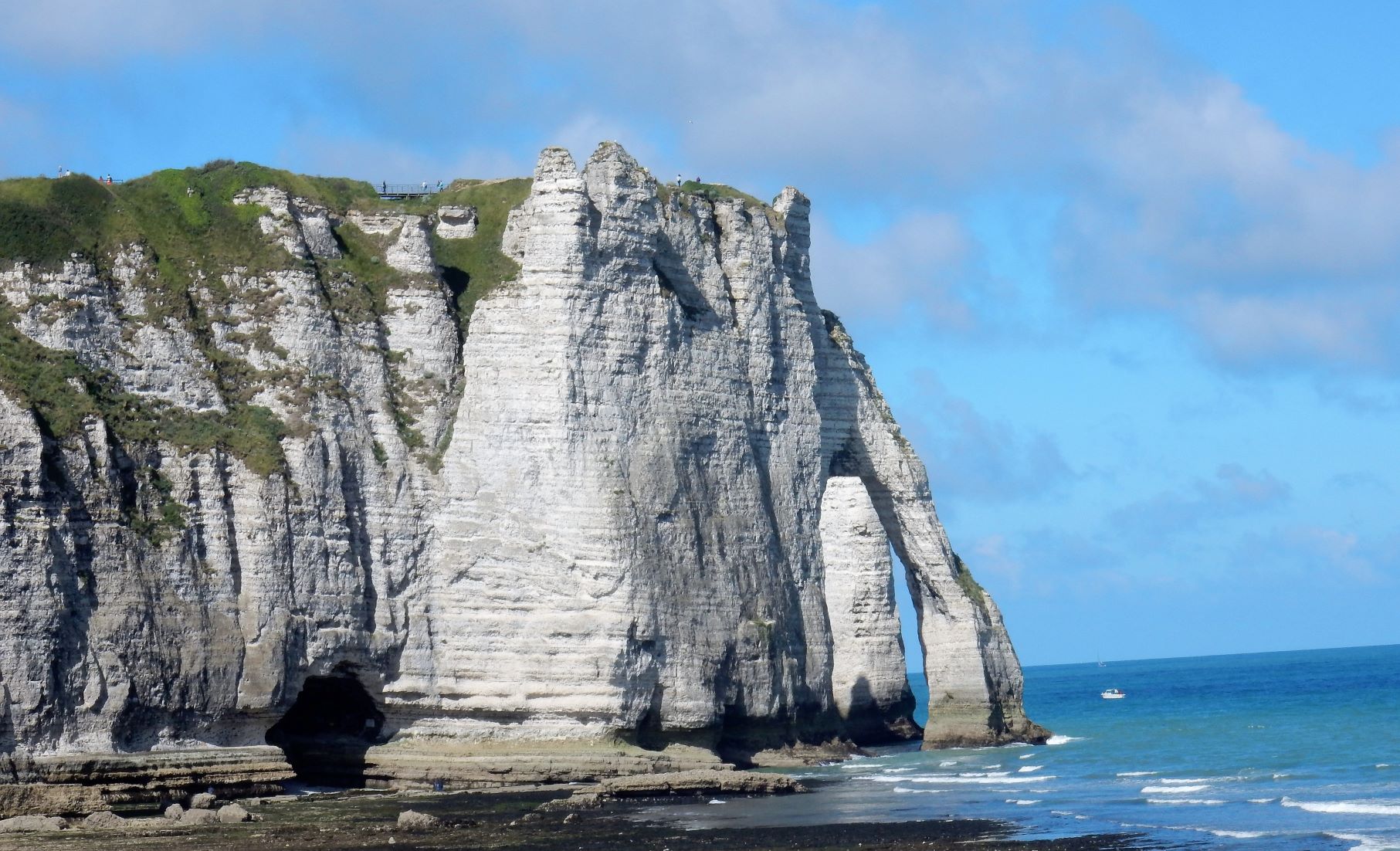 Étretat is best known for its chalk cliffs, including three natural arches and a pointed formation called L’Aiguille or the Needle, which rises 70 meters (230 ft) above the sea. The Etretat Chalk Complex, as it is known, consists of a complex stratigraphy of Turonian and Coniacian chalks. Some of the cliffs are as high as 90 meters (300 ft). These cliffs and the associated resort beach attracted artists including Eugène Boudin, Gustave Courbet and Claude Monet. These cliffs are ever as beautiful as the cliffs of Dover, but for some reason unknown to most folks in the US (if I can be so bold to assume that if I’ve never heard of them most other Americans have not as well). Dover just must have a better publicist.
