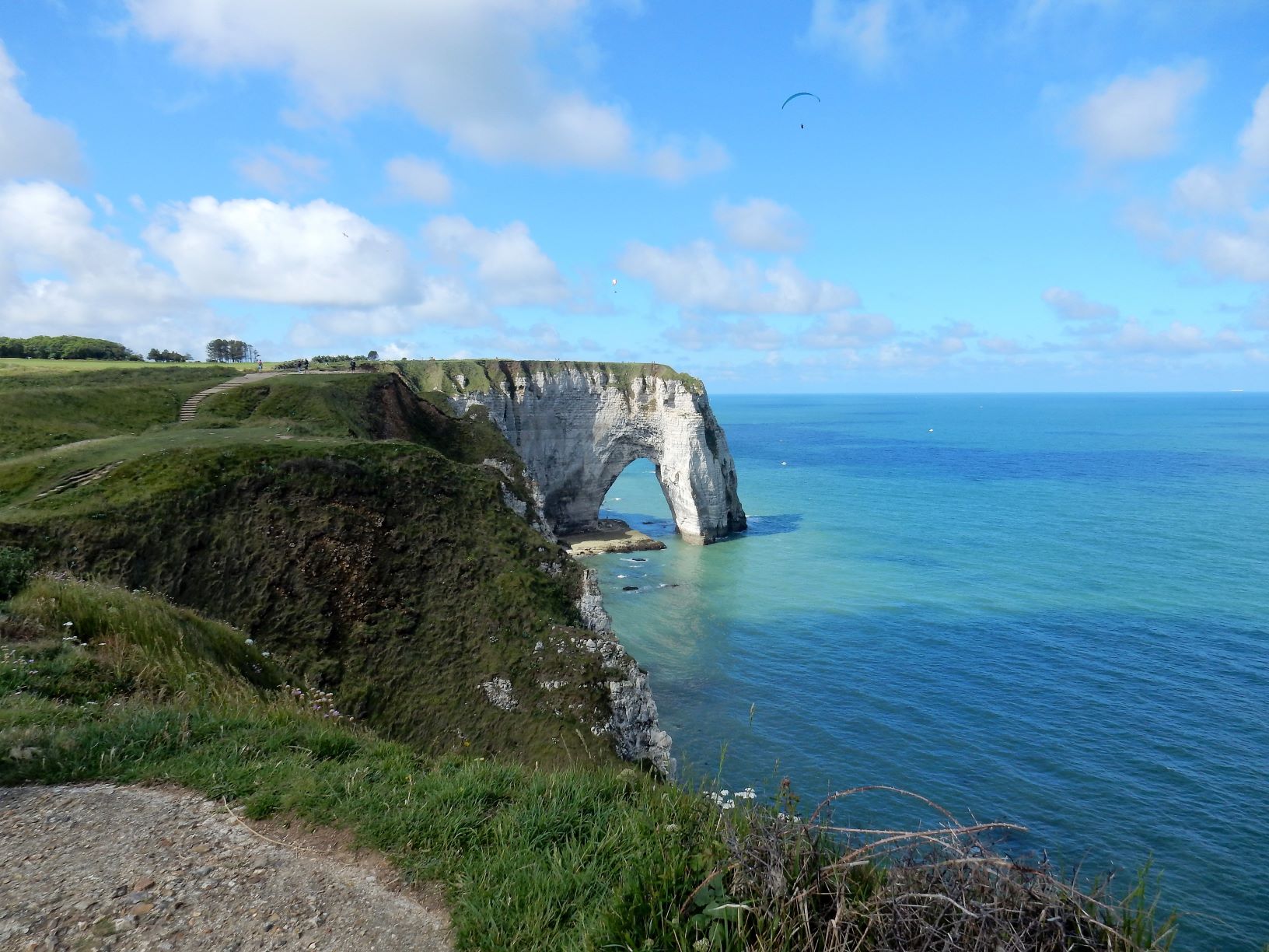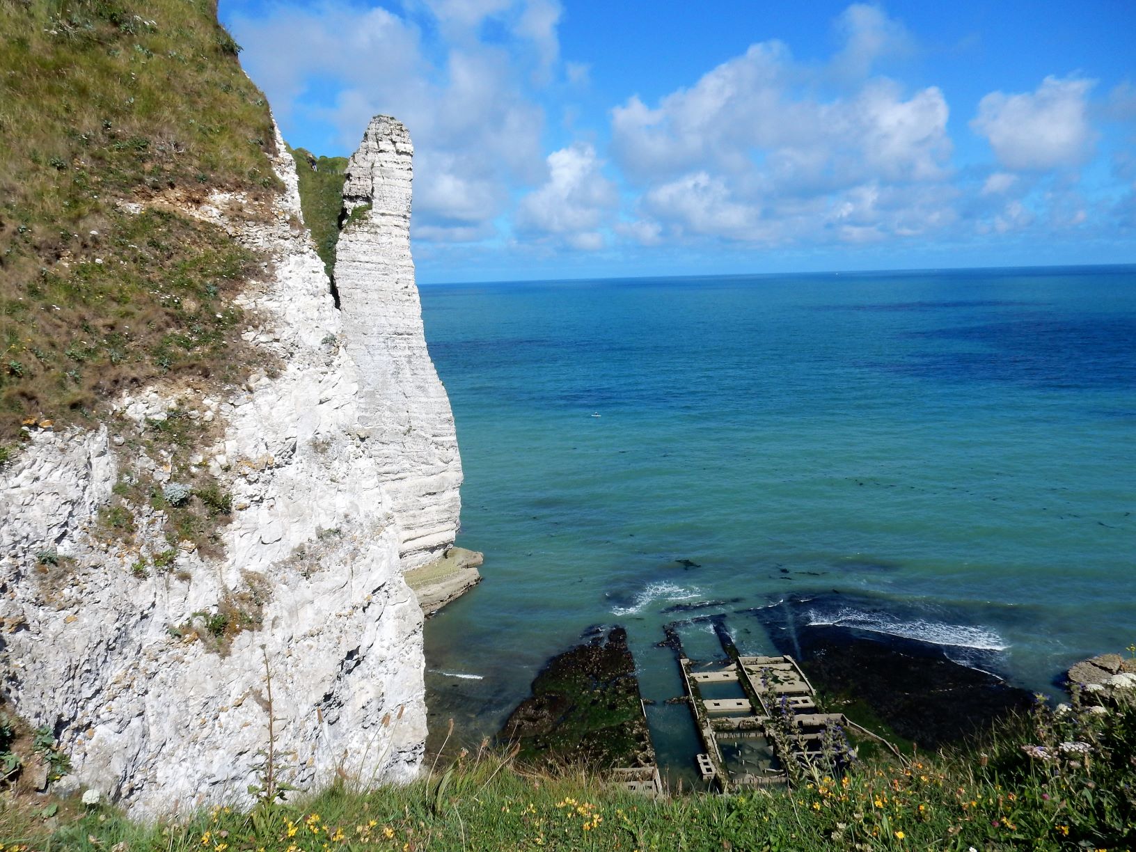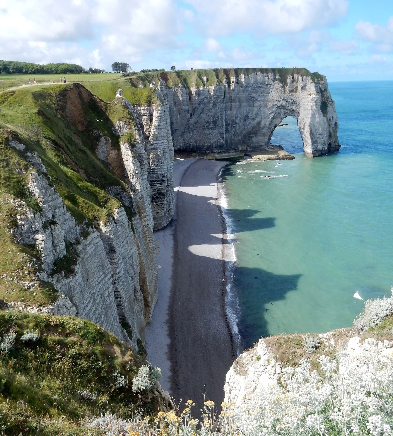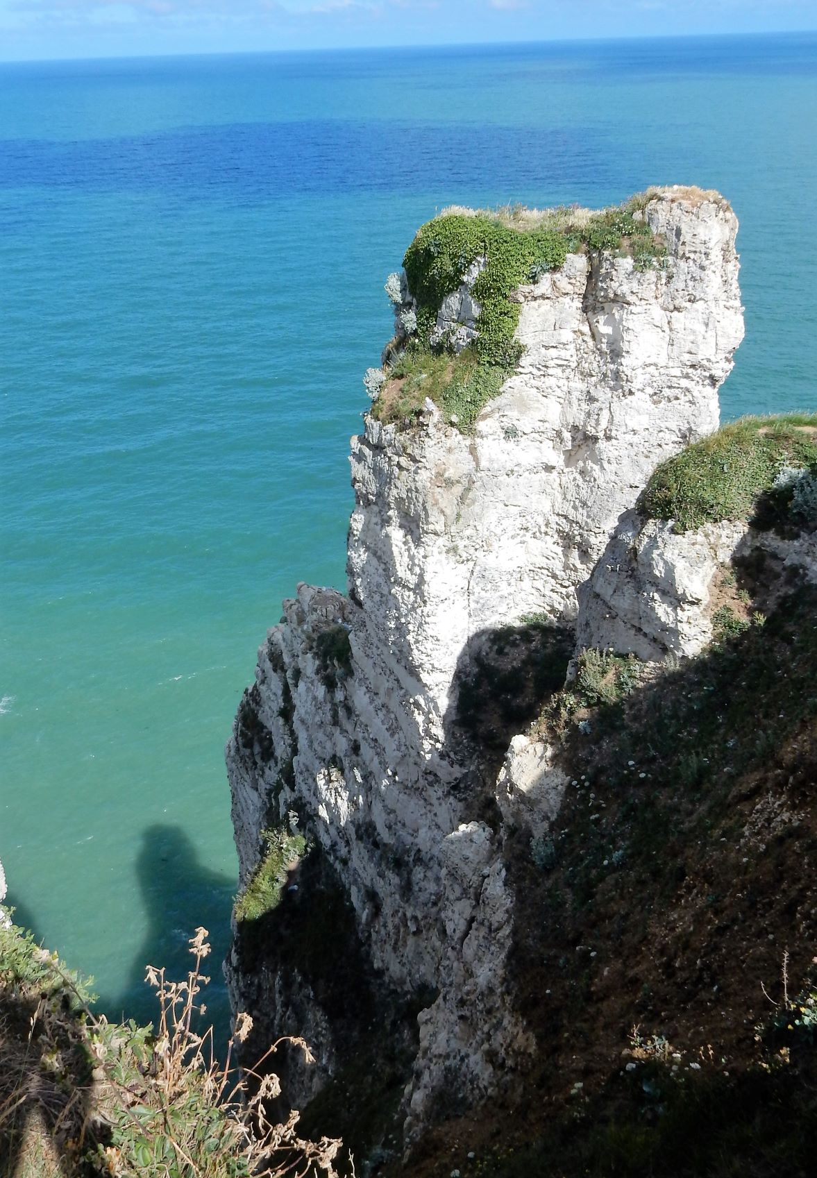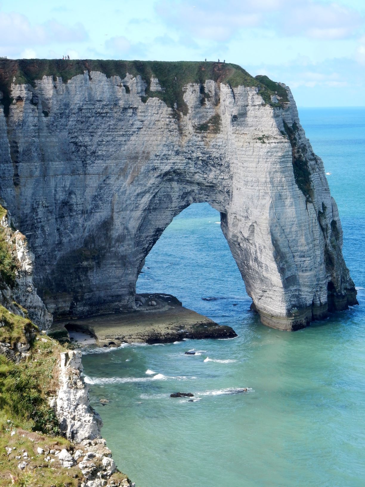 Étretat is best known for its chalk cliffs, including three natural arches and a pointed formation called L’Aiguille or the Needle, which rises 70 meters (230 ft) above the sea. The Etretat Chalk Complex, as it is known, consists of a complex stratigraphy of Turonian and Coniacian chalks. Some of the cliffs are as high as 90 meters (300 ft). These cliffs and the associated resort beach attracted artists including Eugène Boudin, Gustave Courbet and Claude Monet. These cliffs are ever as beautiful as the cliffs of Dover, but for some reason unknown to most folks in the US (if I can be so bold to assume that if I’ve never heard of them most other Americans have not as well). Dover just must have a better publicist.