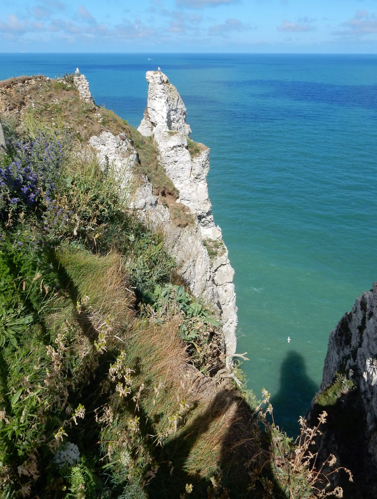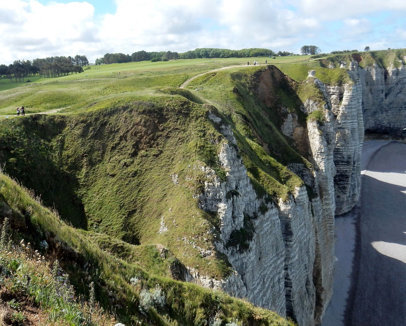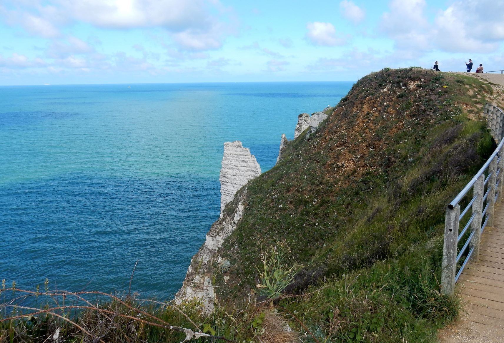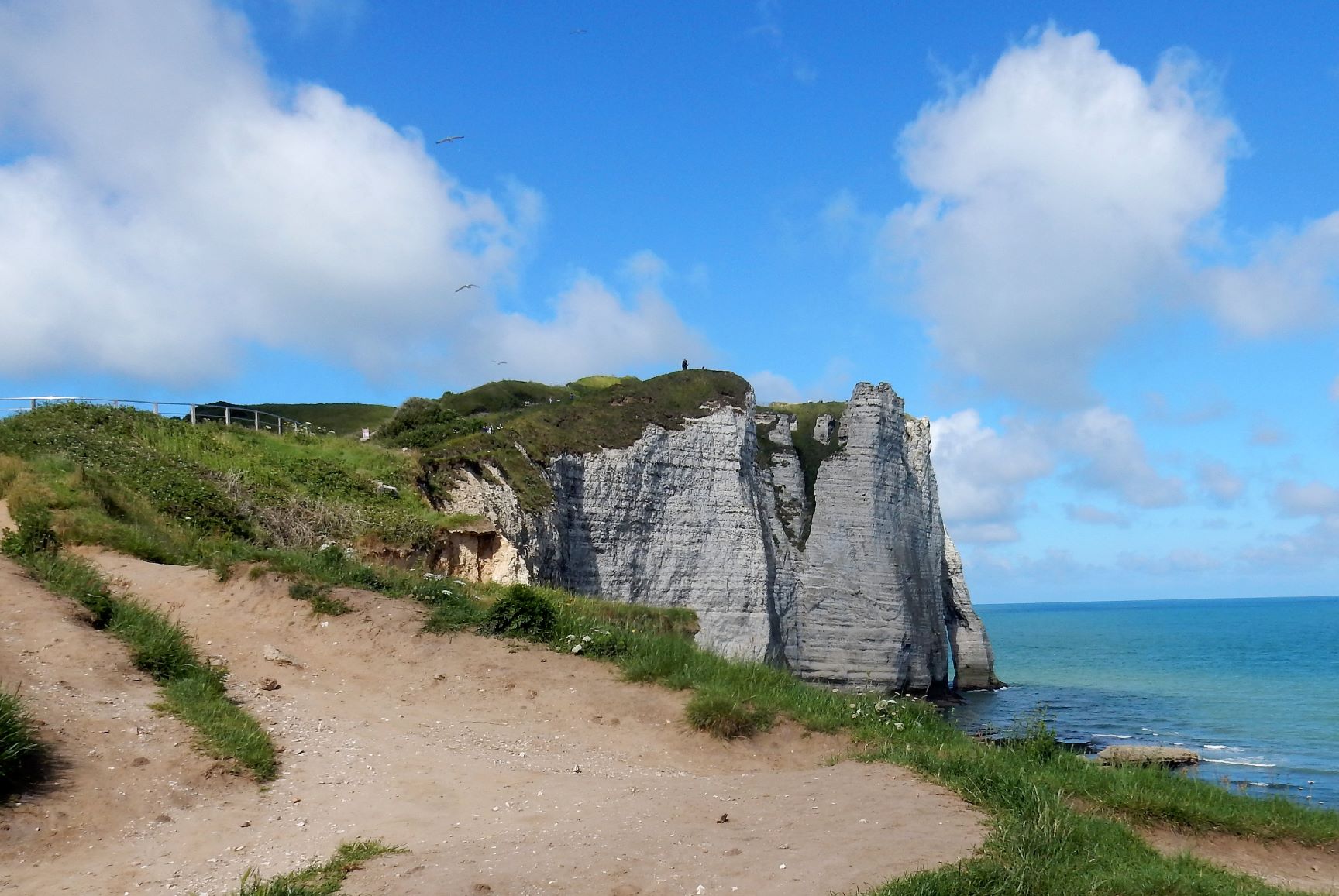 Étretat is best known for its chalk cliffs, including three natural arches and a pointed formation called L’Aiguille or the Needle, which rises 70 meters (230 ft) above the sea. The Etretat Chalk Complex, as it is known, consists of a complex stratigraphy of Turonian and Coniacian chalks. Some of the cliffs are as high as 90 meters (300 ft). These cliffs and the associated resort beach attracted artists including Eugène Boudin, Gustave Courbet and Claude Monet. These cliffs are ever as beautiful as the cliffs of Dover, but for some reason unknown to most folks in the US (if I can be so bold to assume that if I’ve never heard of them most other Americans have not as well). Dover just must have a better publicist.
