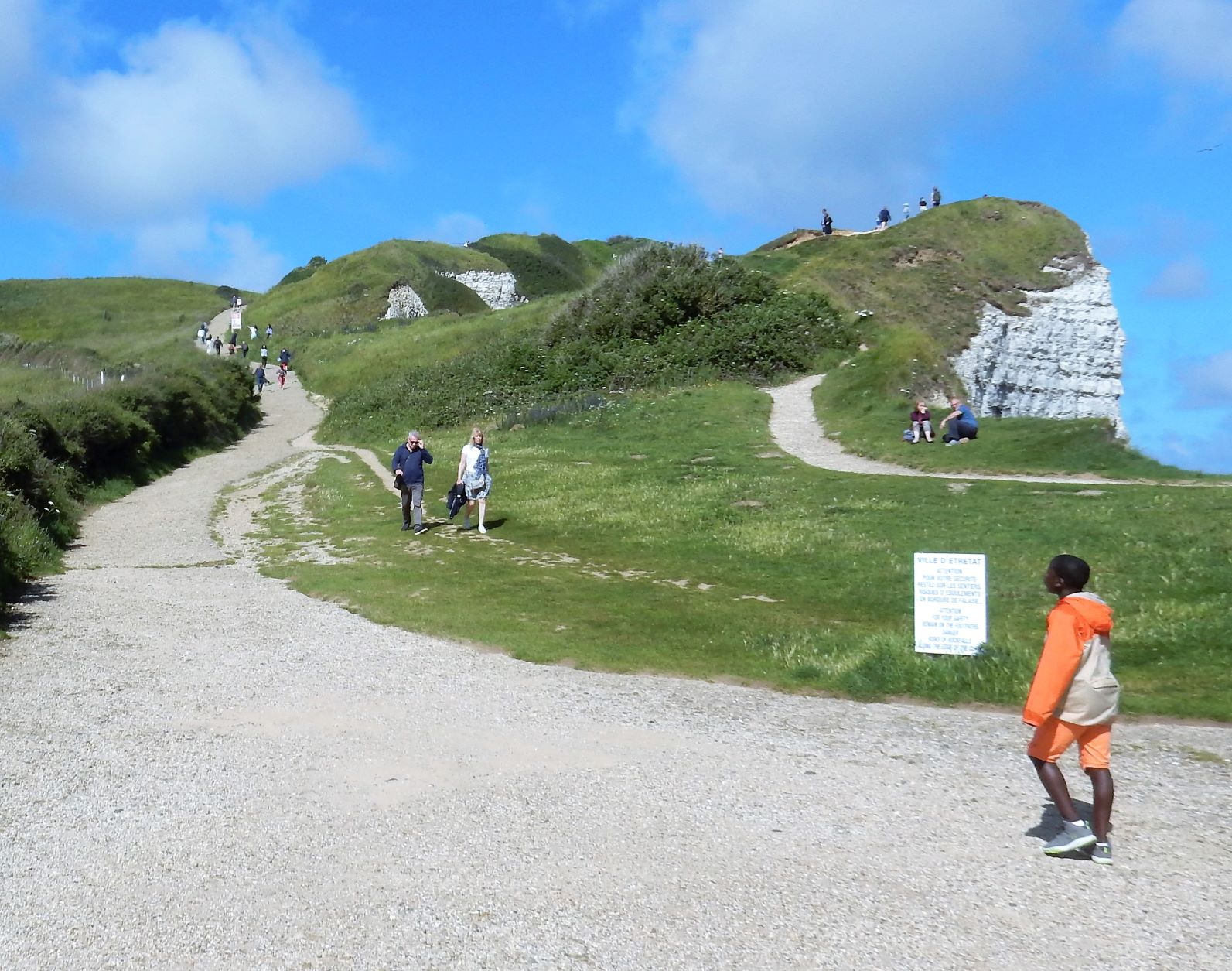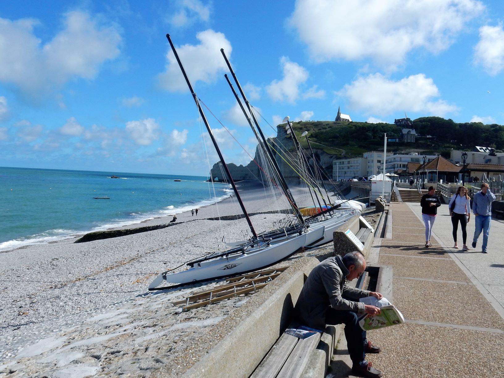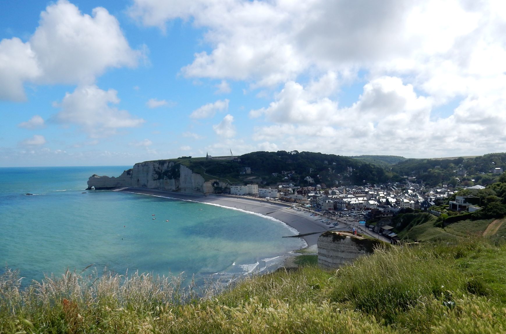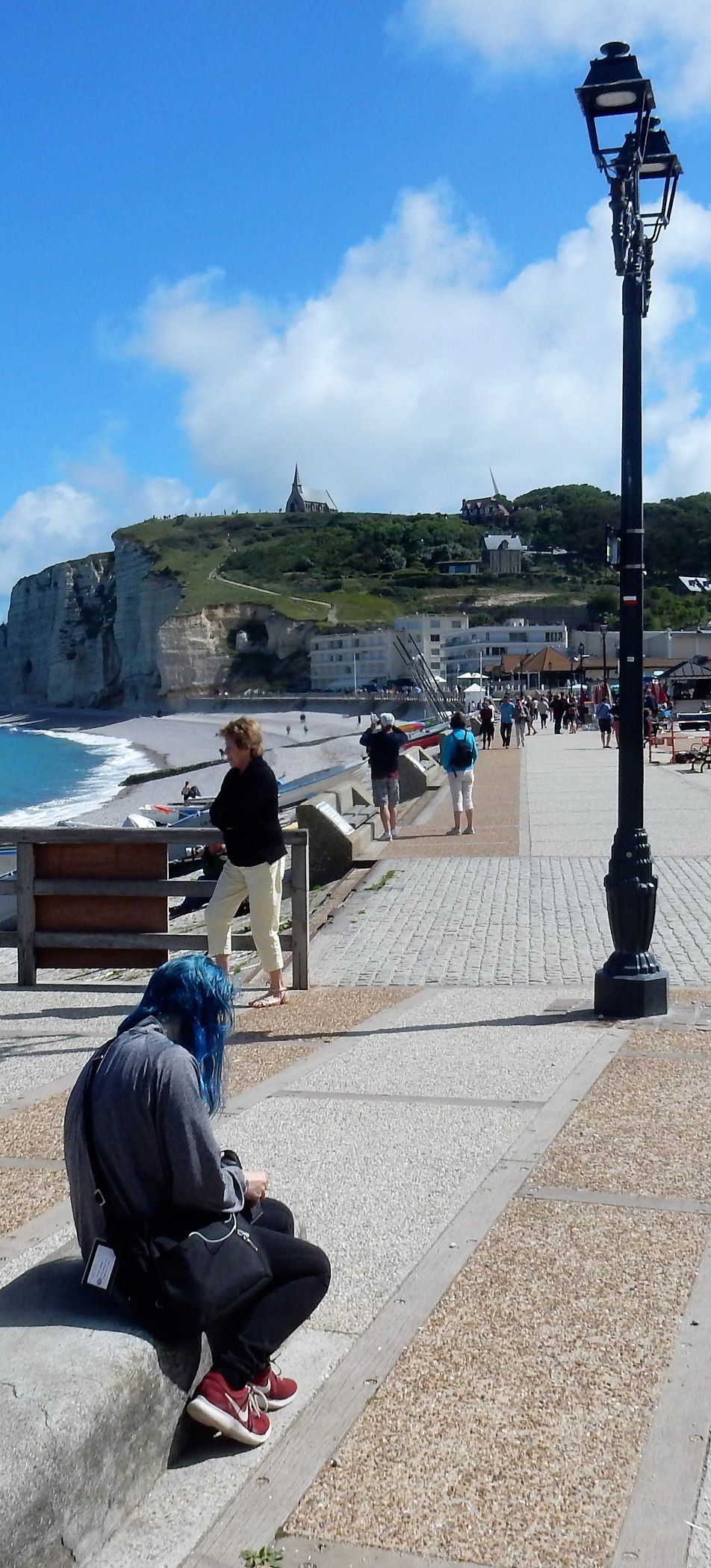 Jacques (Jock, or John if you want to Anglicize the name) the manager at Les Pins told us we must go to Étretat before we turn south for Mont Saint Michel after we leave Le Havre. It was some of the best advice we’ve received on this trip. Étretat is a commune (village) in the Seine-Maritime department in Normandy in north-western France. Originally it was a farming town on the coast of the English Channel about 32 km (20 mi) north of Le Havre, but now, it looks as if there’s as much tourist trade going on here as wheat growing.