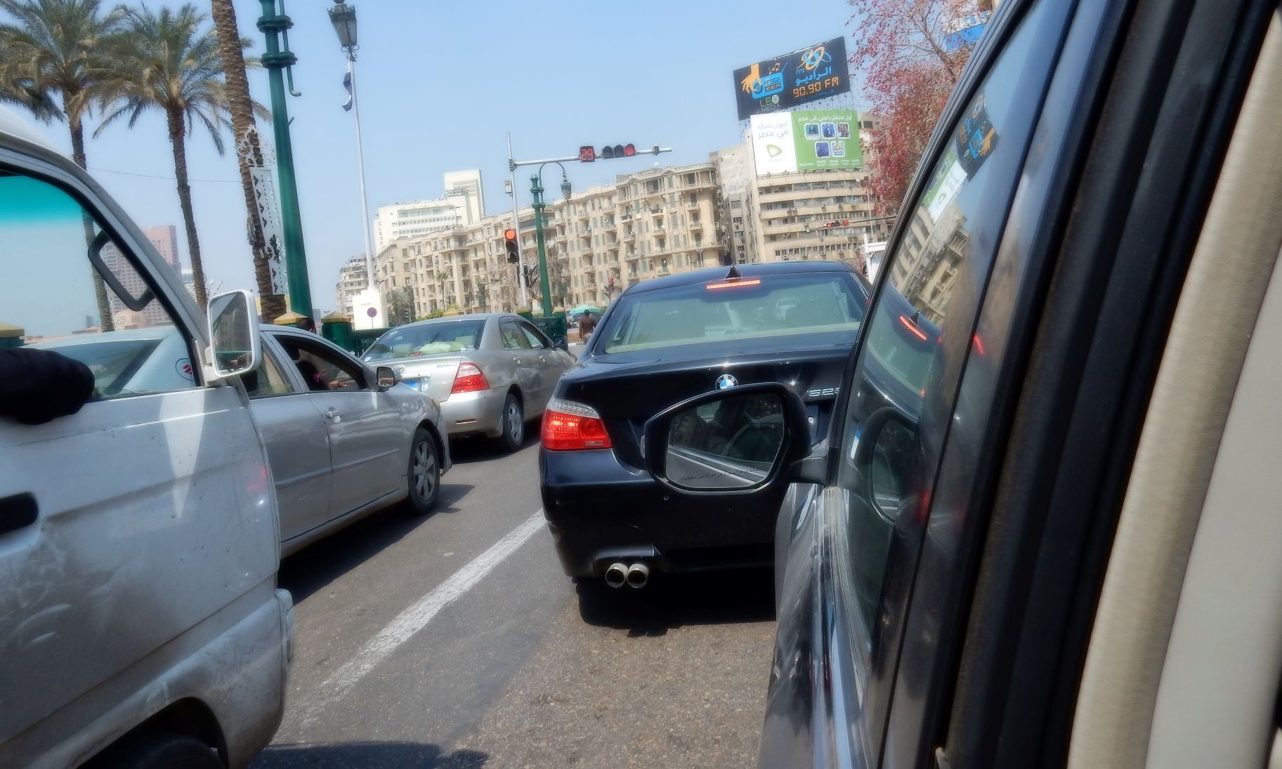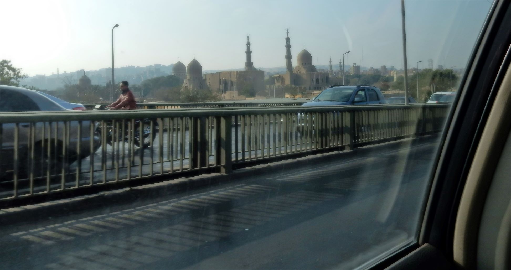 No matter how I describe it, the details cannot compare to the reality of driving in this city. These guys are amazing (women drivers too), crisply moving in and out of streams of cars, brushing pedestrians without bruising, or creasing their garments, avoiding vehicles stopping or changing lanes without the sounds of screeching tires, or crumpling metal. Think of anything a driver could perform in the US that would earn the blast of horns, shaking fists, and screams of “You Fucking Idiot!!!!!!!” and Egyptian drivers deal with it a dozen times a minute without a moment of road rage. But there are horns. A symphony of horns. Horns of every tone and timber used with frequency, relish and pattern. Car horns are more essential to Egyptian drivers than brakes or turn signals. I think I’ve deciphered the horn-honking pattern etiquette of Cairo: