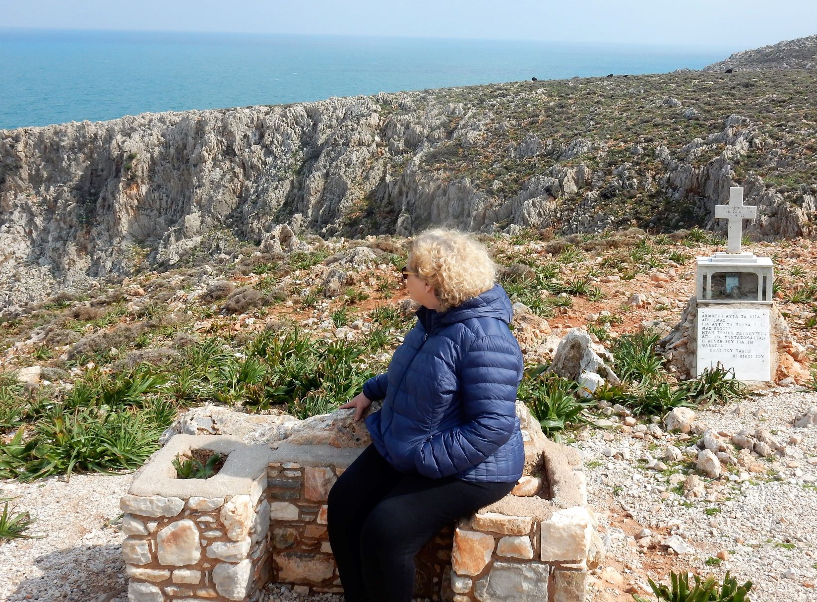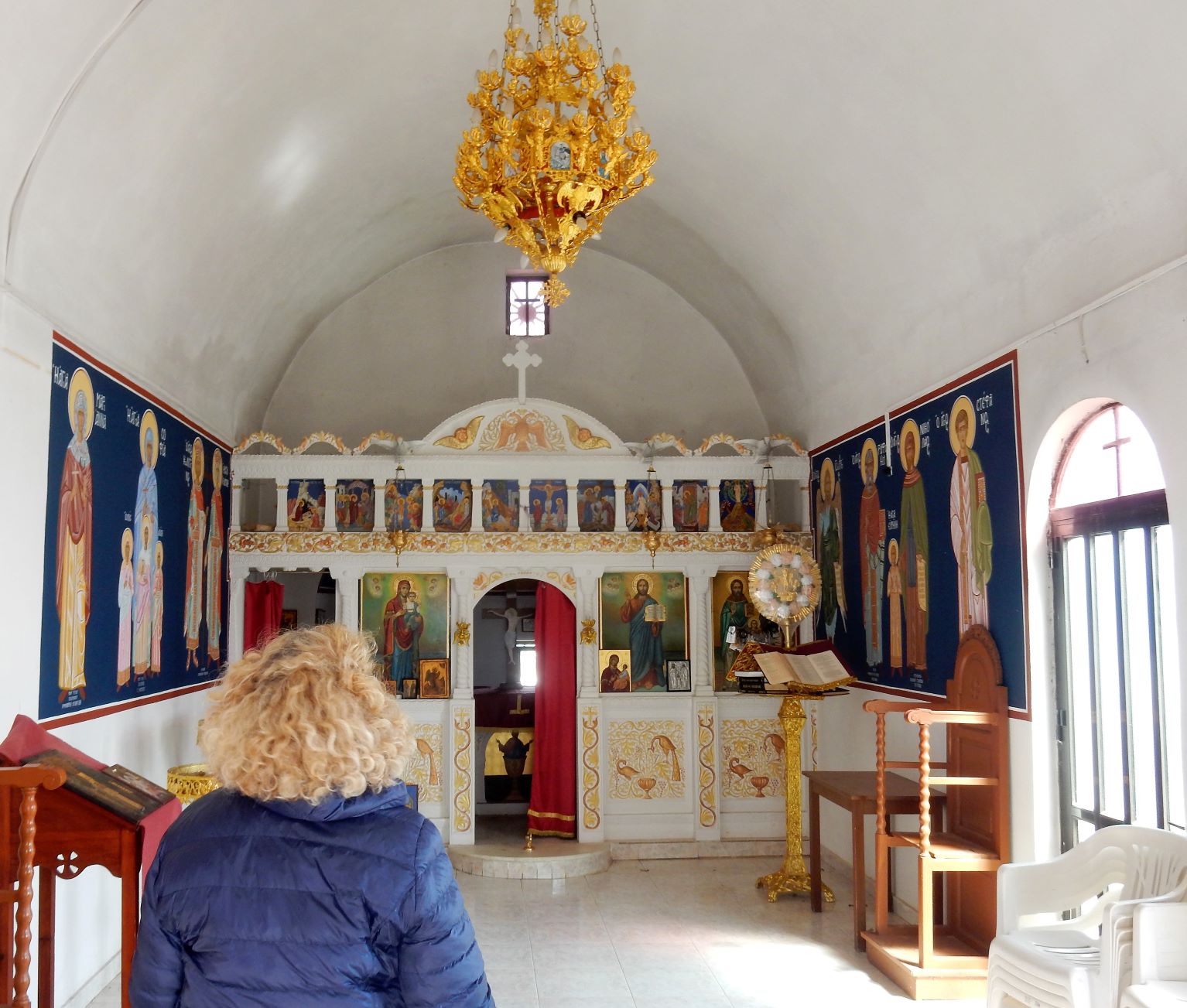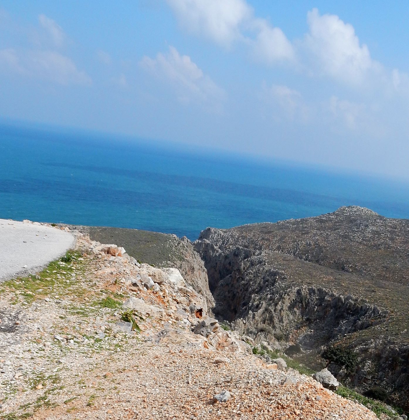 Starting slowly, we had breakfast at home and then went east to Marathi on the Souda Bay, on the southeastern coast of Akrotiri. It is a popular resort but we were only two of about a dozen in the area. It does have two beautiful beaches with fine-grained sand (which is unusual on Crete) and shallow calm water, in a bay sheltered by Old Suda Island. The beaches are separated by a small pier, which from what I could tell only served fishing boats and a few pleasure craft. There is a row of beach cabins and restraunts along the bay so you never need worry about getting hungry or thirsty.