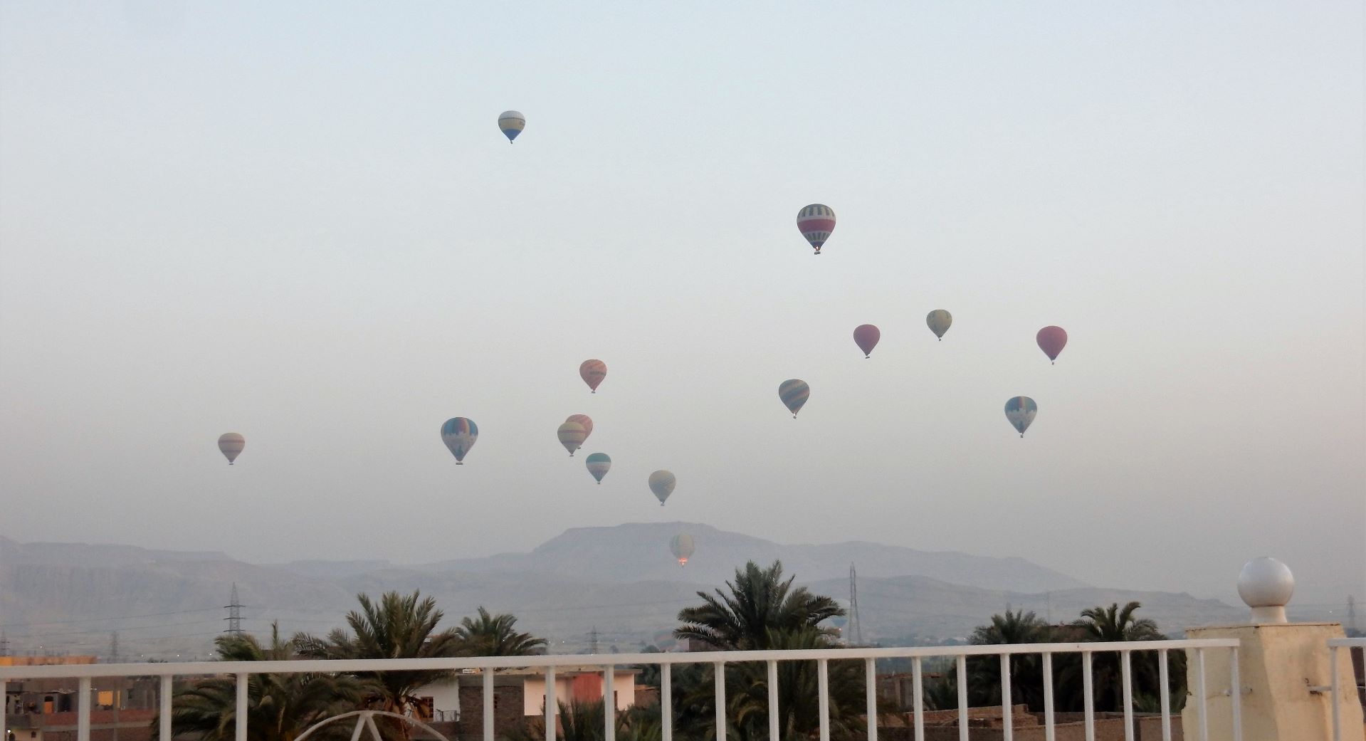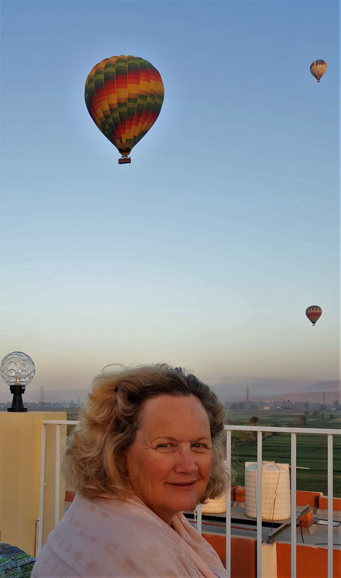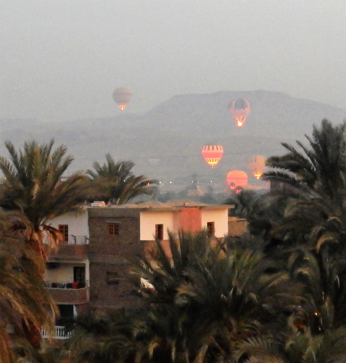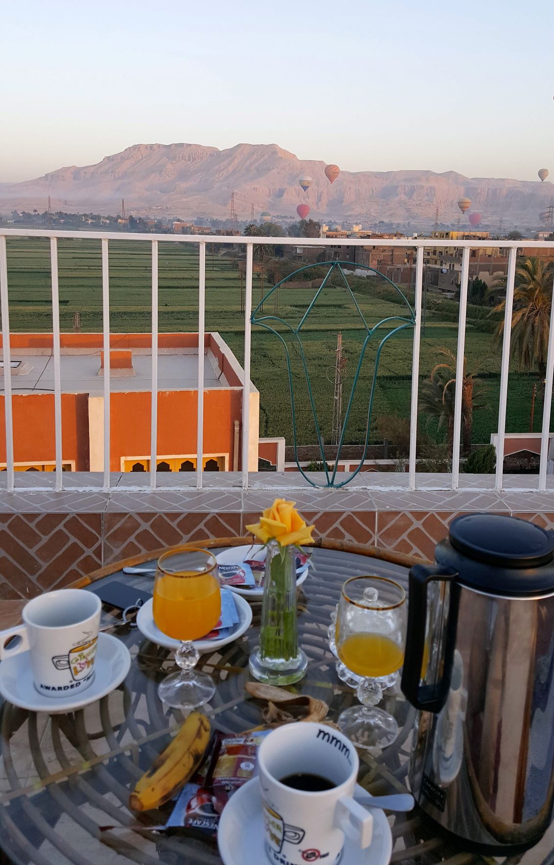 We were up early (5 AM), we had arranged for our car to be there at 6 to take us to the airport. We took breakfast and coffee on the rooftop at 5:30 which gave us one last opportunity to experience Luxor at sunrise and watch the launch of the hot air balloons before we leave.