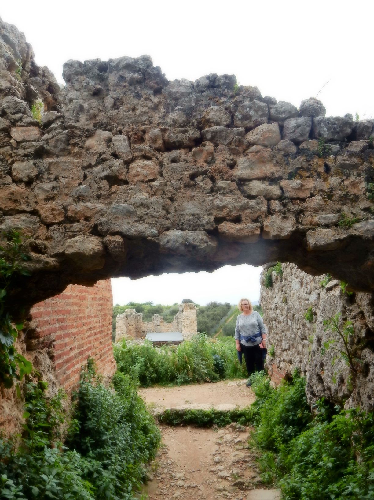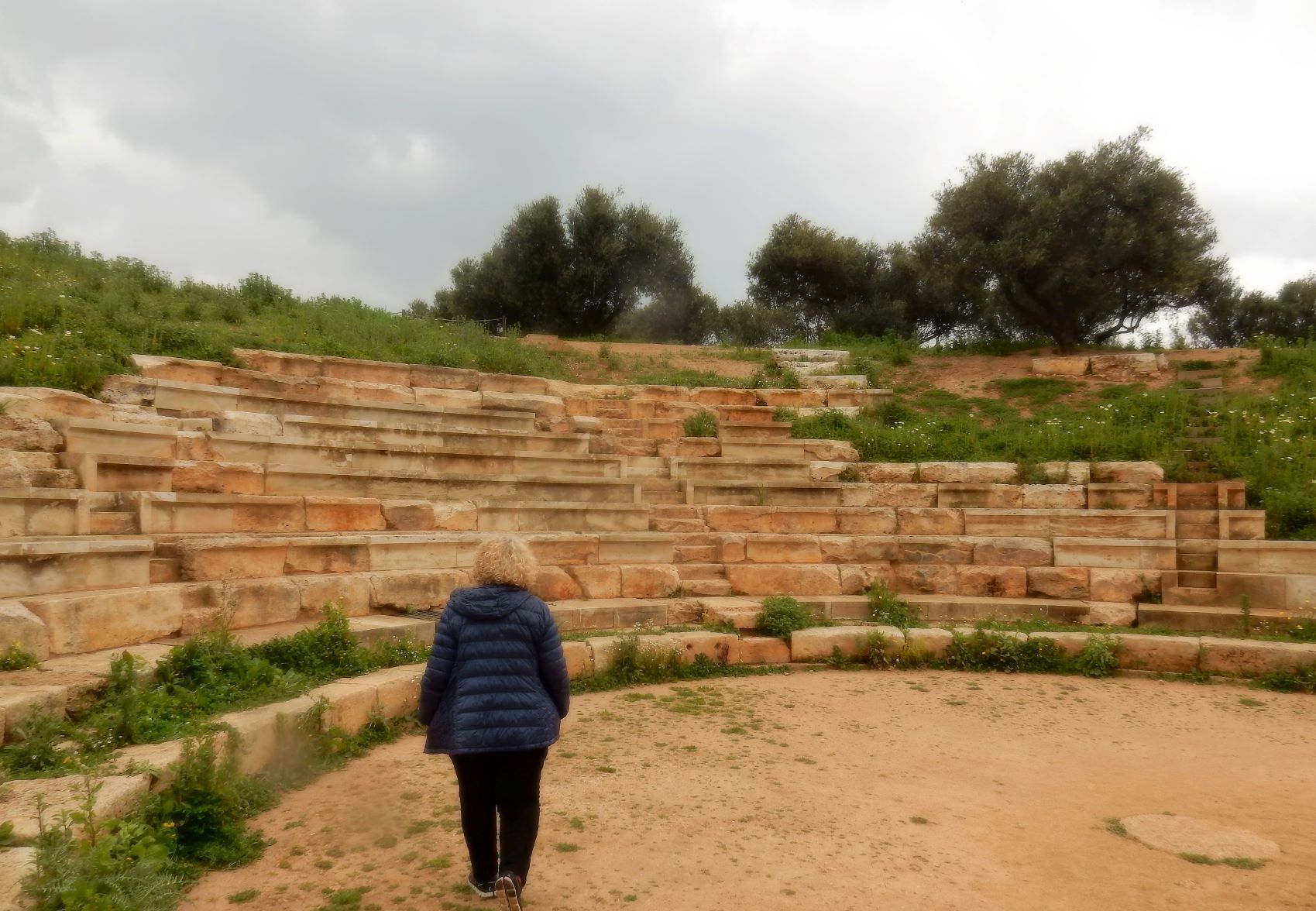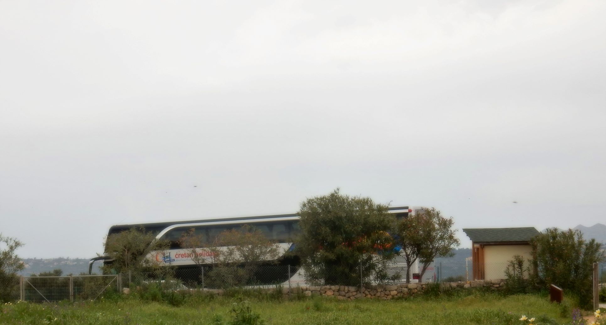Of course, the day we chose to visit Aptera was projected to be cold, windy, with scattered showers beginning around 2PM. So, yeah let’s trek up the side of an escarpment to an ancient acropolis on roads meant to carry mopeds and mule carts. Sounds like a well-thought-out idea. So, yeah that’s what we did. We had no problem going to the village below the site, but as we wound our way up the hill we saw a problem. No, 5 problems. Tour busses. Honest, we haven’t encountered these so far, but there they were….busses, heading down hill on a road 13 feet wide.