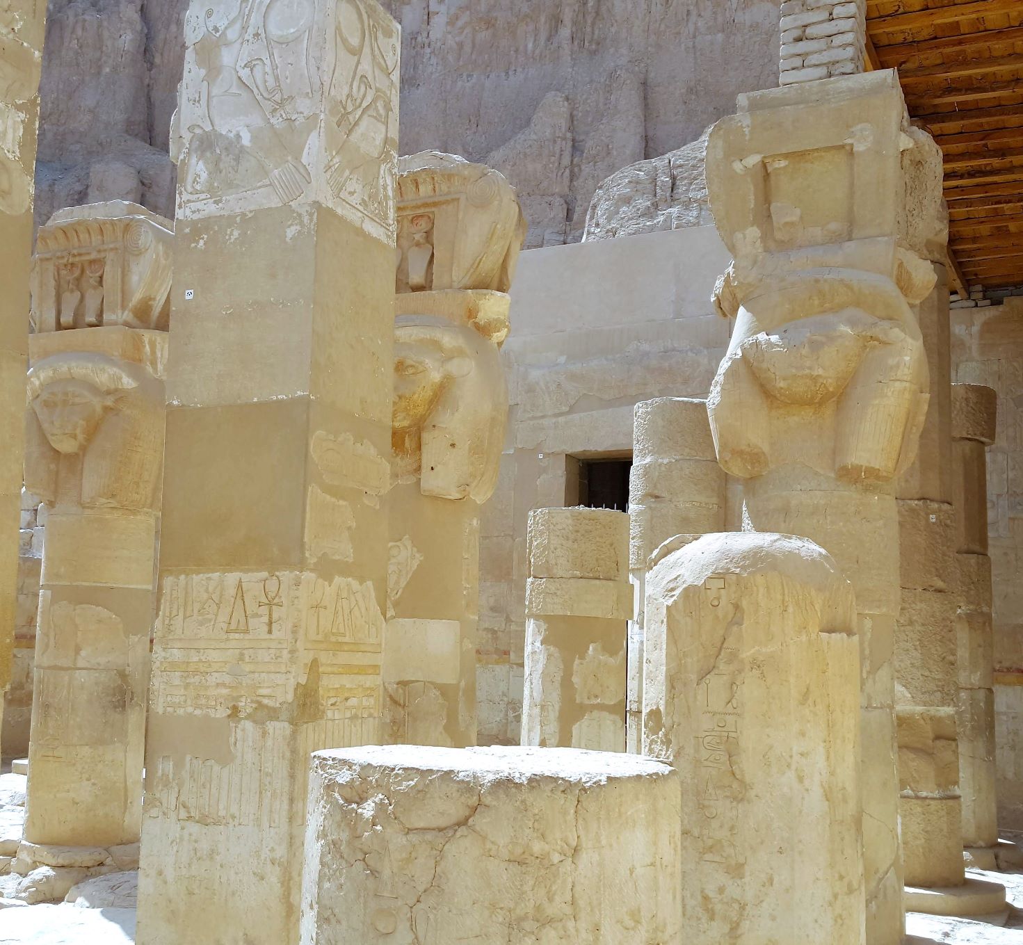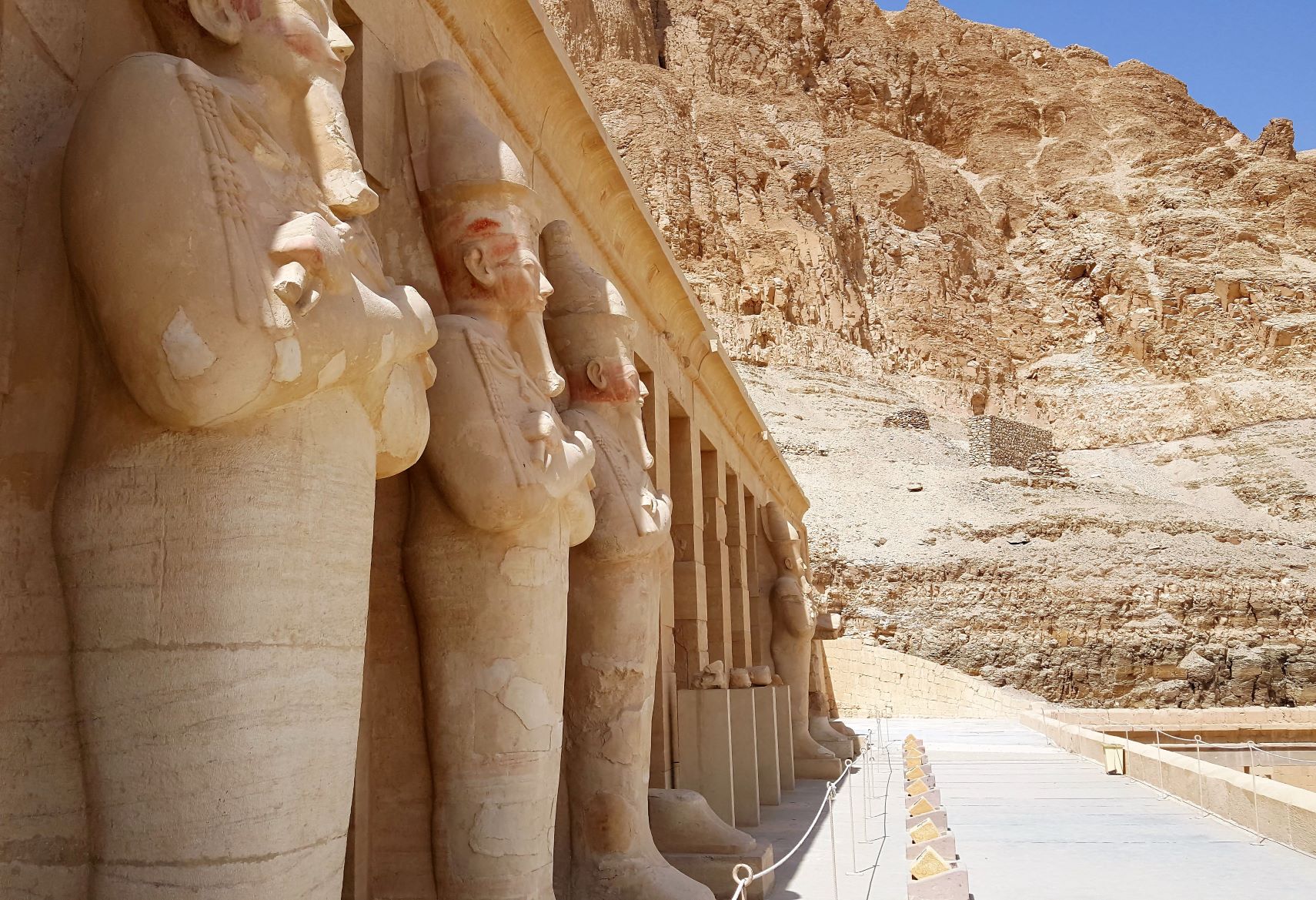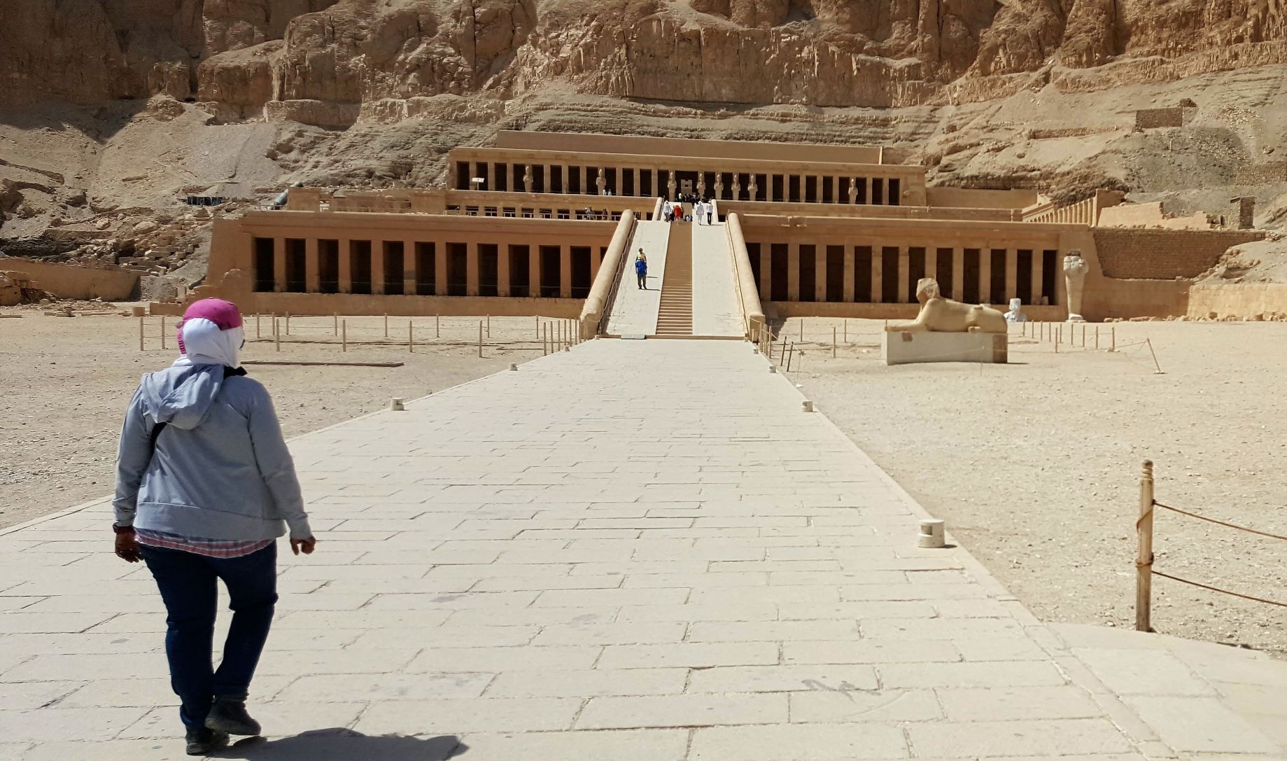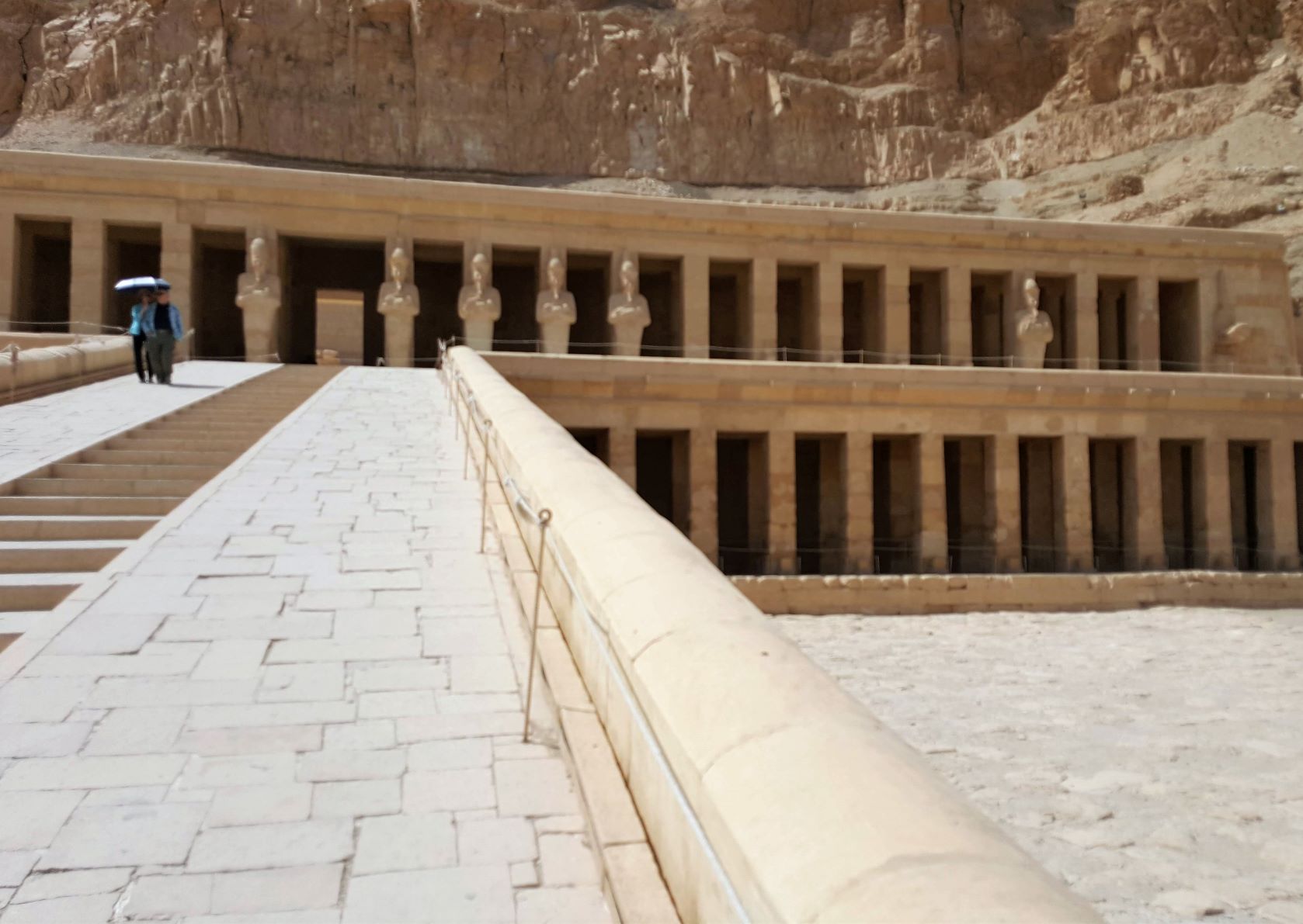 Around the corner to the right of the colossi is the Mortuary Temple of Hatshepsut, also known as the Djeser-Djeseru. It’s a mortuary temple built for the Eighteenth Dynasty pharaoh Hatshepsut (a lady pharaoh that glued on a beard to blend in), it is located beneath the cliffs at Deir el-Bahari on the west bank of the Nile near the Valley of the Kings (she wasn’t allowed into the boys club in spite of the fake whiskers). The temple, dedicated to the god Amun is situated next to the mortuary temple of Mentuhotep II, which served both as an inspiration and later, a quarry. The temple is considered one of the “incomparable monuments of ancient Egypt.” (probably written by a tour guide in the Egyptian Department of Antiquities).
