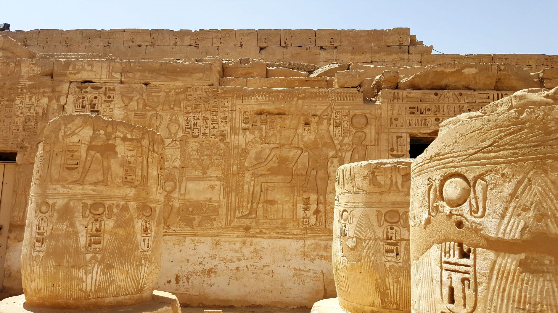 Next down the road is the Ramesseum, which is the memorial temple (or mortuary temple) of Pharaoh Rameses II. It was researched and explored by a Frenchman Jean-François Champollion, who visited the ruins of the site in 1829 and first identified the hieroglyphs making up Rameses’s names and titles on the walls. It was originally called the House of millions of years of Usermaatra-setepenra. It is an impressive structure, rivaling the temples on the east side of the Nile.