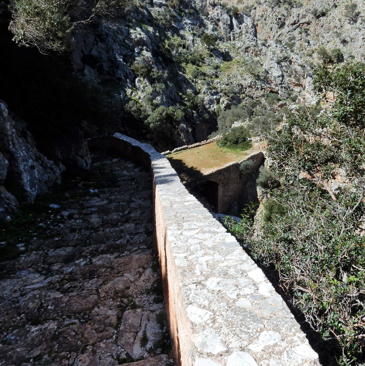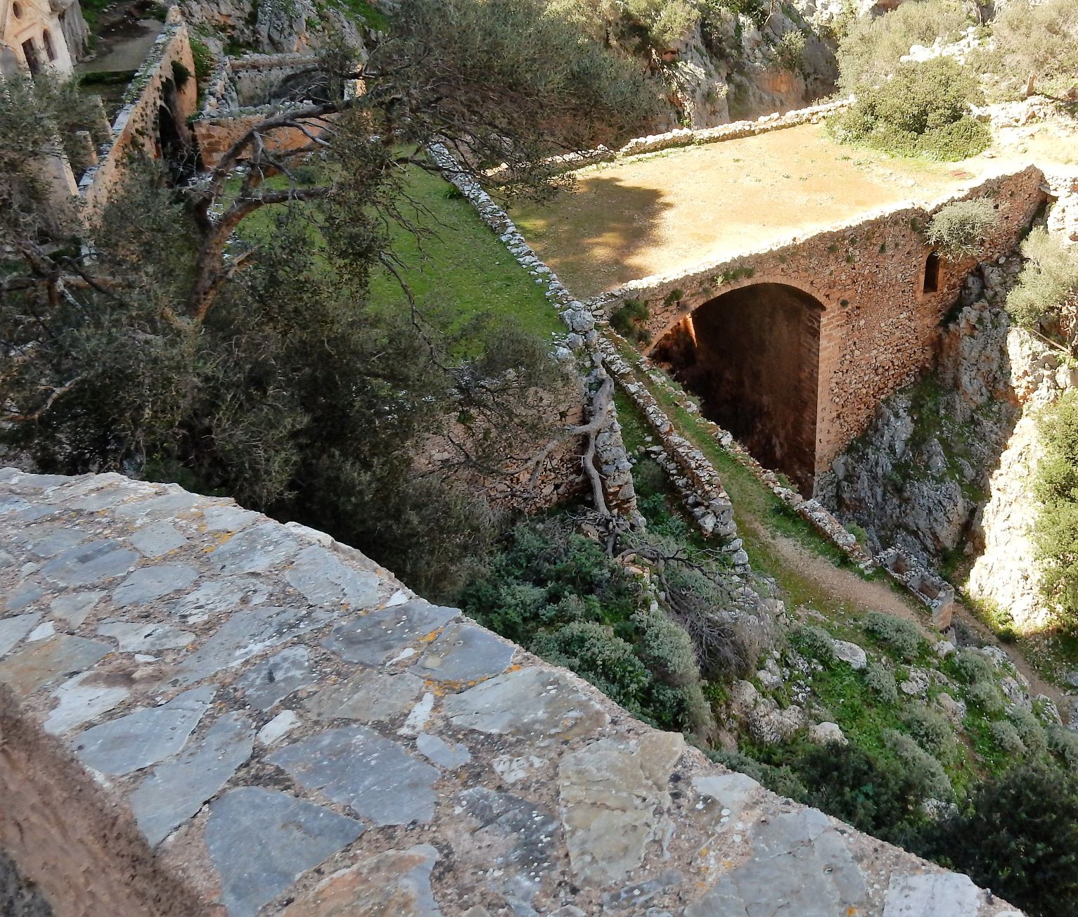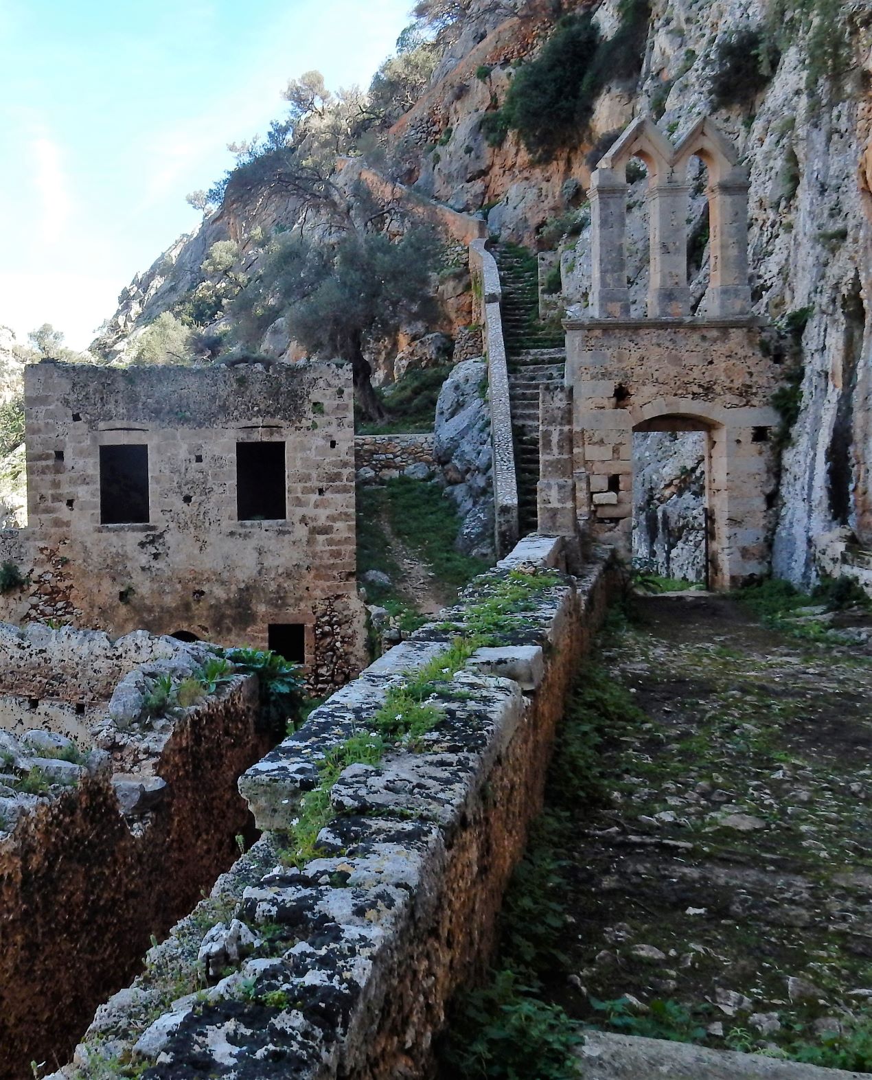 The monastery is now deserted, but can be accessed by the trail that that starts from the gates of Monastery Gouverneto (20-30 minute walk). The nicest thing about this walk is there’s a parking lot for your car and its easy to come through the gate and take the hike. In the monastery there is the Cathedral of St. John the Hermit and his Cave, the ruined monks’ cells (dank holes in the wall) and the impressive old bridge that crosses the river. Beneath the floor of the bridge there are still several storage rooms. To be honest, we’d been to Monastery Gouverneto before, but we thought you needed to find Moni Katholiko from a trail that started in Stavros, which is about 6 klicks to the west.