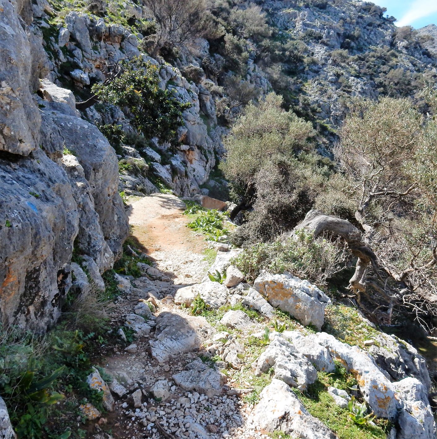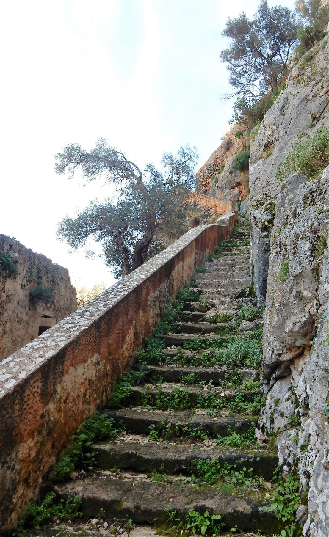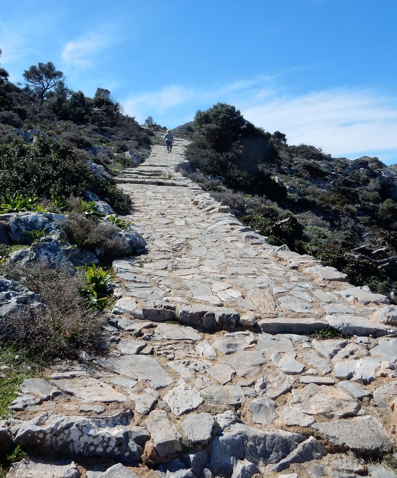 You can keep walking down over a dry creek bed for 10 minutes to the sea. There is supposed to be a delightful small beach and swimming with the ruins of the old harbor monastery, but it looked like a sprained ankle waiting to happen so we didn’t make this trek. If you want to get your 10,000 steps in on a nice hike on a cobble path with 100 switch-backs, this is the place for you. I’ll give it 4 stars.