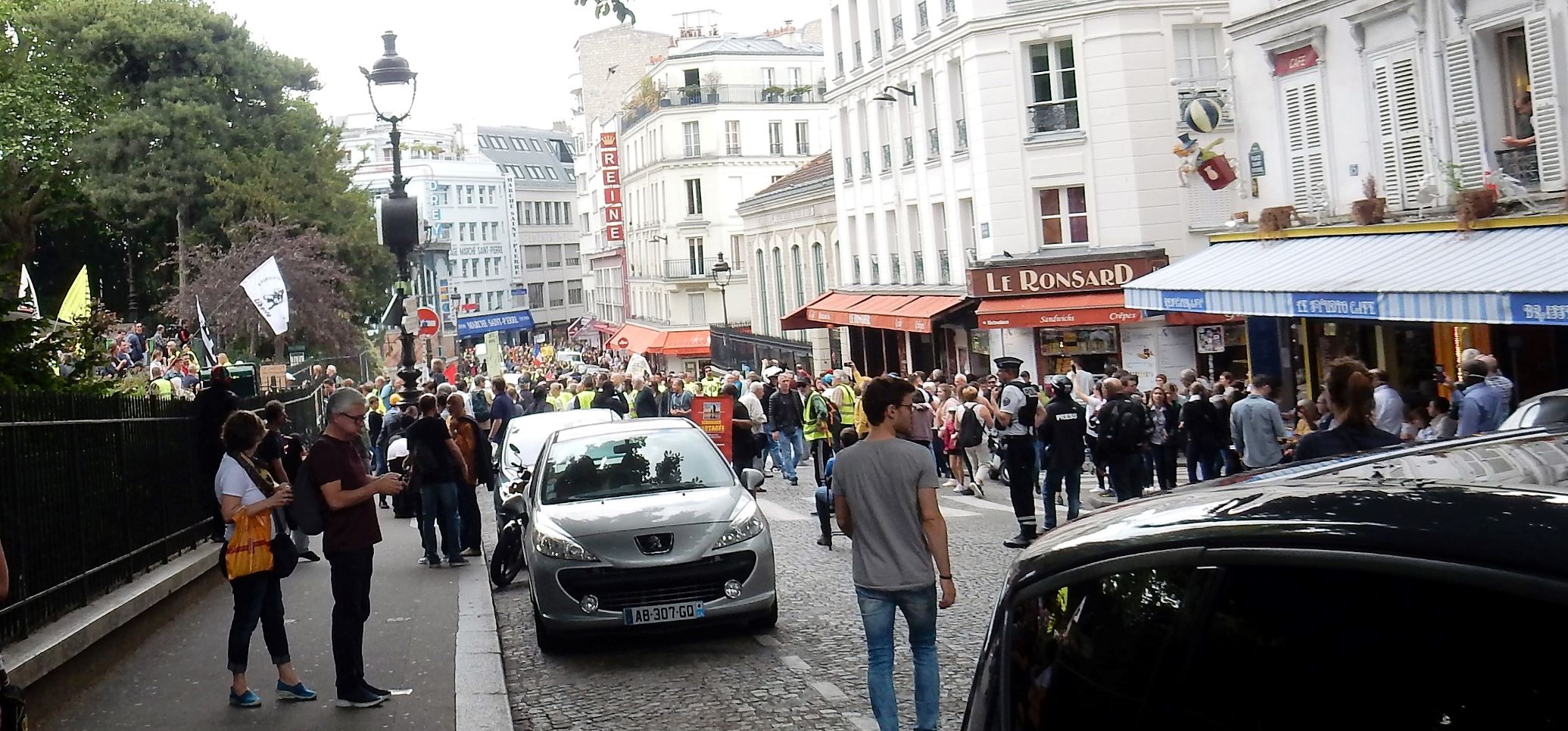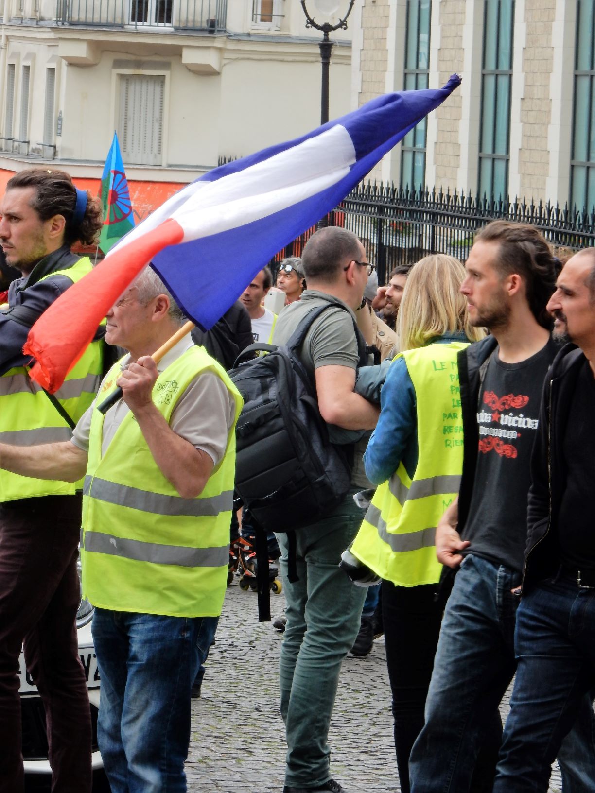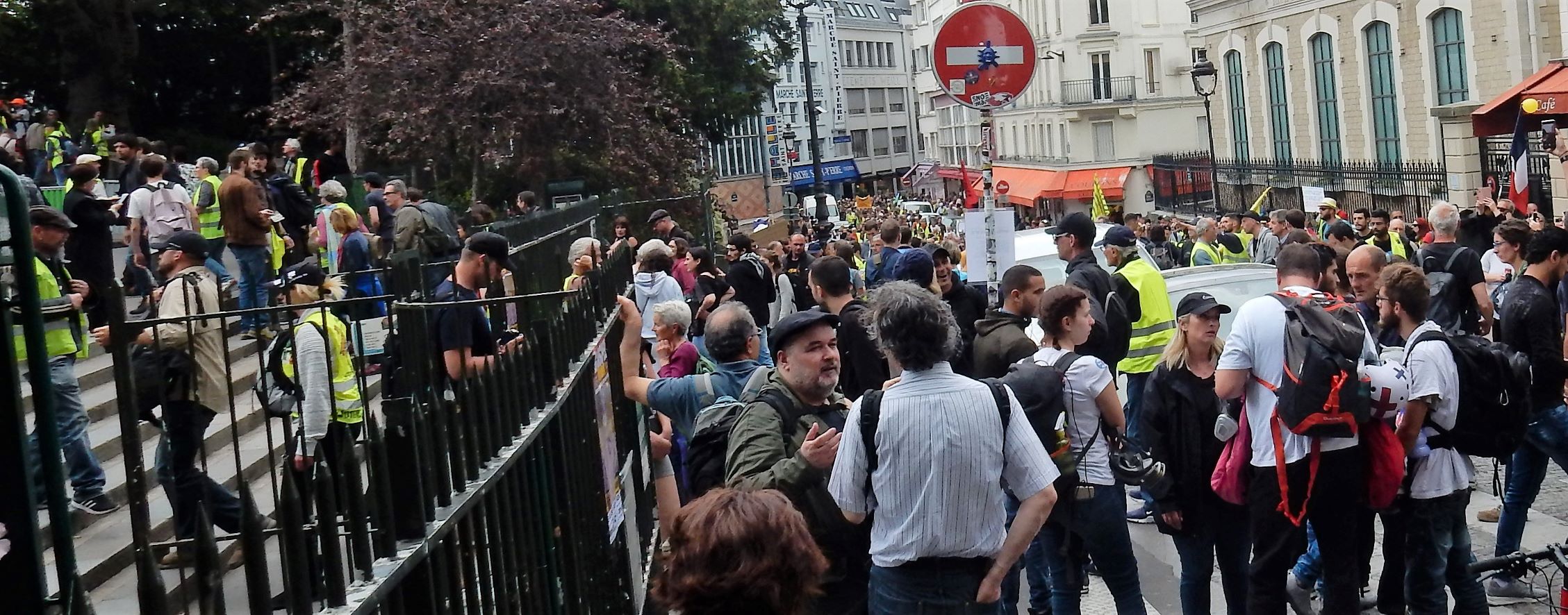 After leaving Montmartre, we ran smack dab into a demonstration (which is what we precisely attempted not to do). As we descended the hill from the cathedral we ran into a wave of humanity being guarded by swarms of police in tactical gear. No violence was seen, but a few confrontations, lots of chanting, and people dressed up like they were picking up garbage on the highways. Most of them were old farts like us, but there were some young guys/girls as well. I’d heard about violent confrontations with police in the past, but today was on the quiet side at this event. The yellow vests or yellow jackets movement is a populist, revolutionary political movement for economic justice that began in France in October 2018. After an online petition posted in May had attracted nearly a million signatures, mass demonstrations began in November, 2018 in Paris.