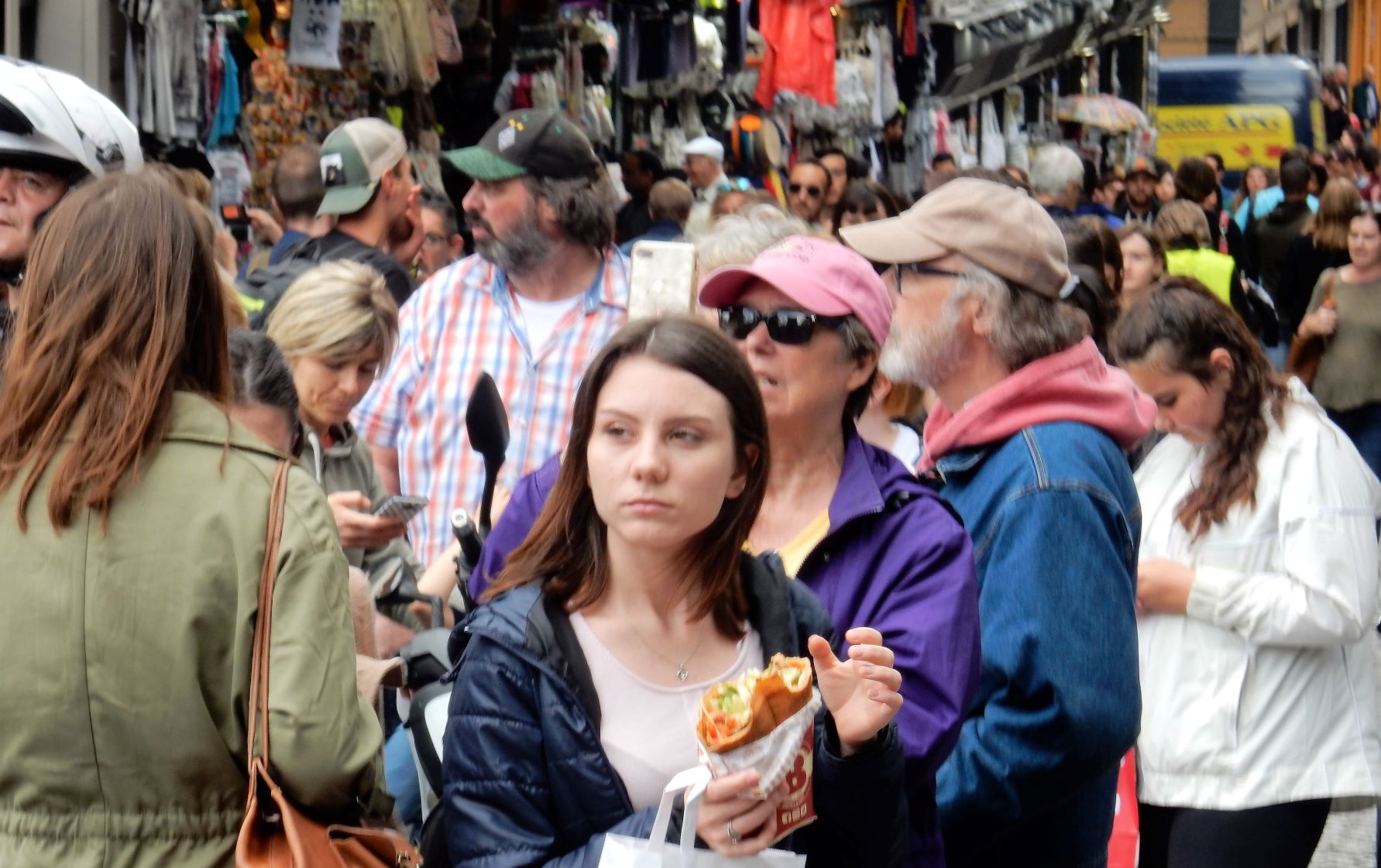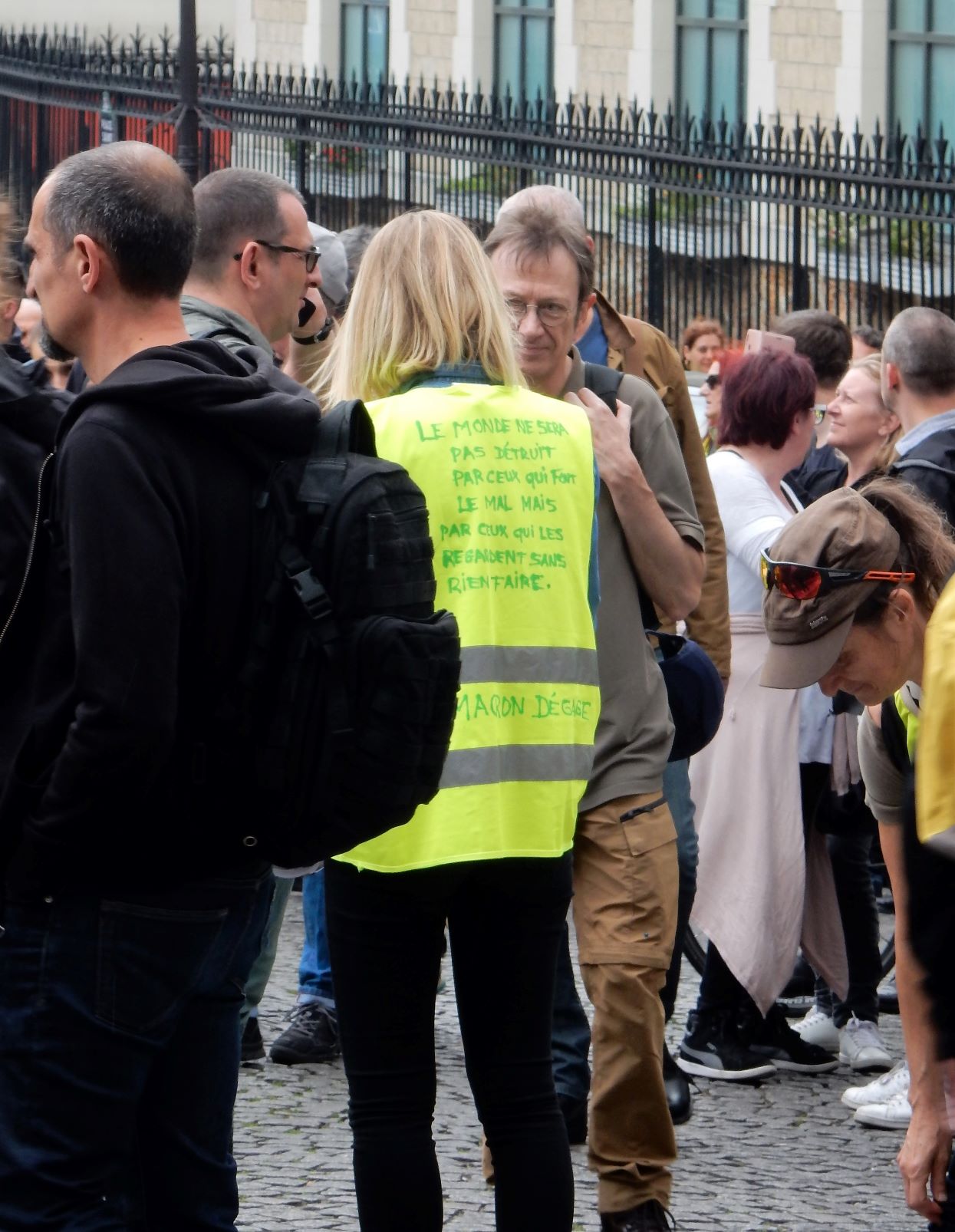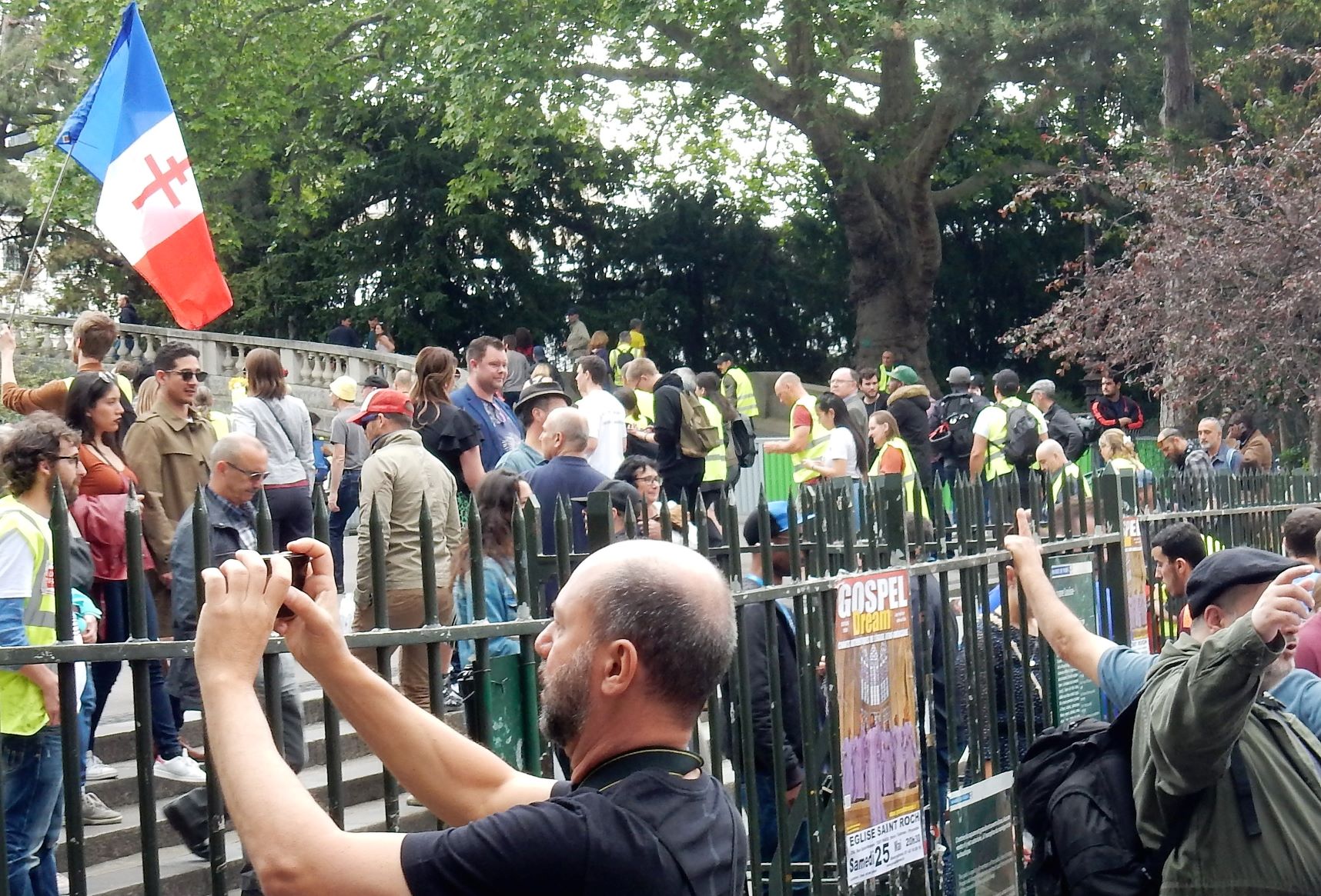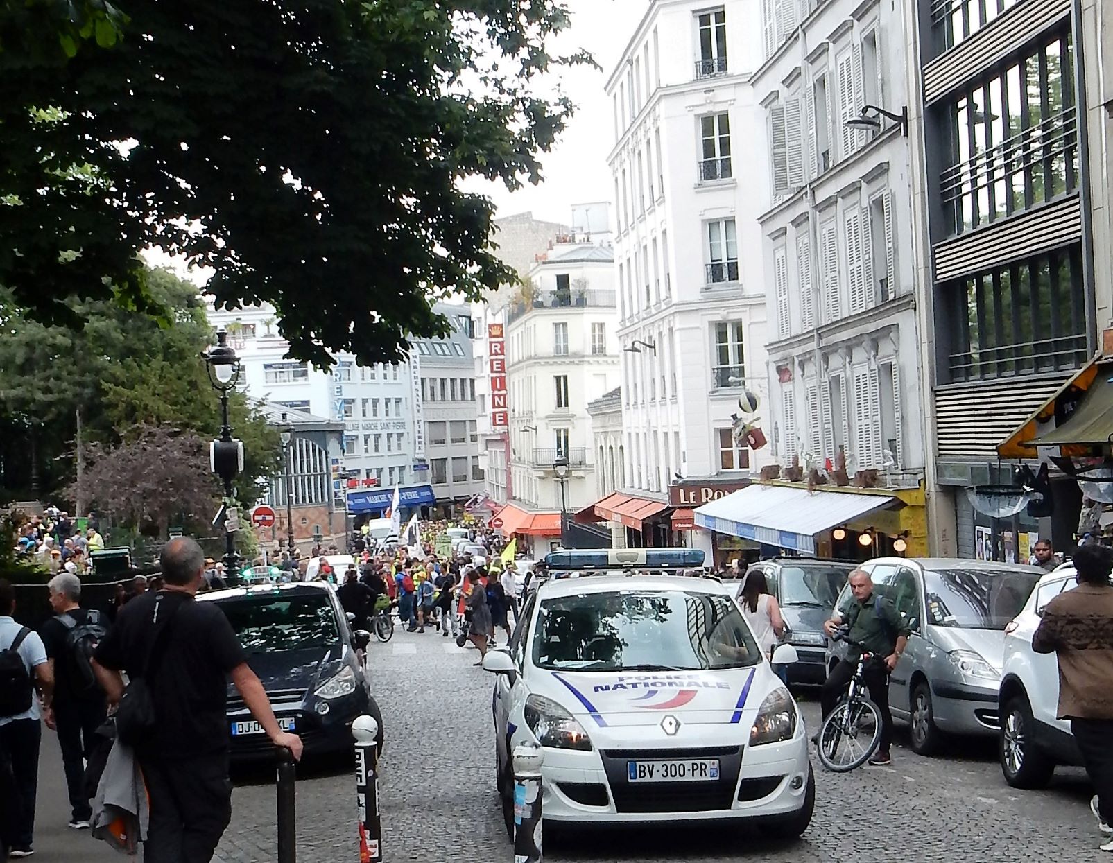 After leaving Montmartre, we ran smack dab into a demonstration (which is what we precisely attempted not to do). As we descended the hill from the cathedral we ran into a wave of humanity being guarded by swarms of police in tactical gear. No violence was seen, but a few confrontations, lots of chanting, and people dressed up like they were picking up garbage on the highways. Most of them were old farts like us, but there were some young guys/girls as well. I’d heard about violent confrontations with police in the past, but today was on the quiet side at this event. The yellow vests or yellow jackets movement is a populist, revolutionary political movement for economic justice that began in France in October 2018. After an online petition posted in May had attracted nearly a million signatures, mass demonstrations began in November, 2018 in Paris.