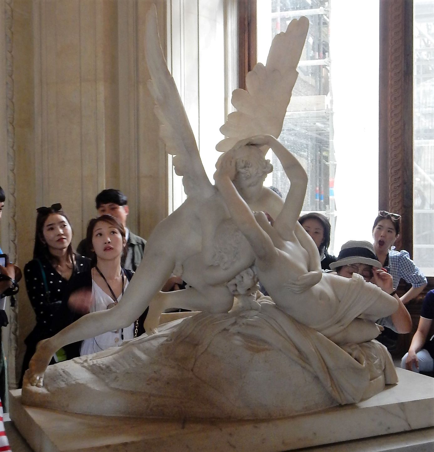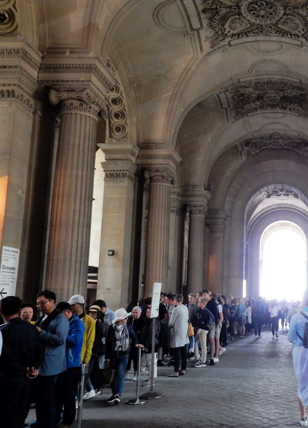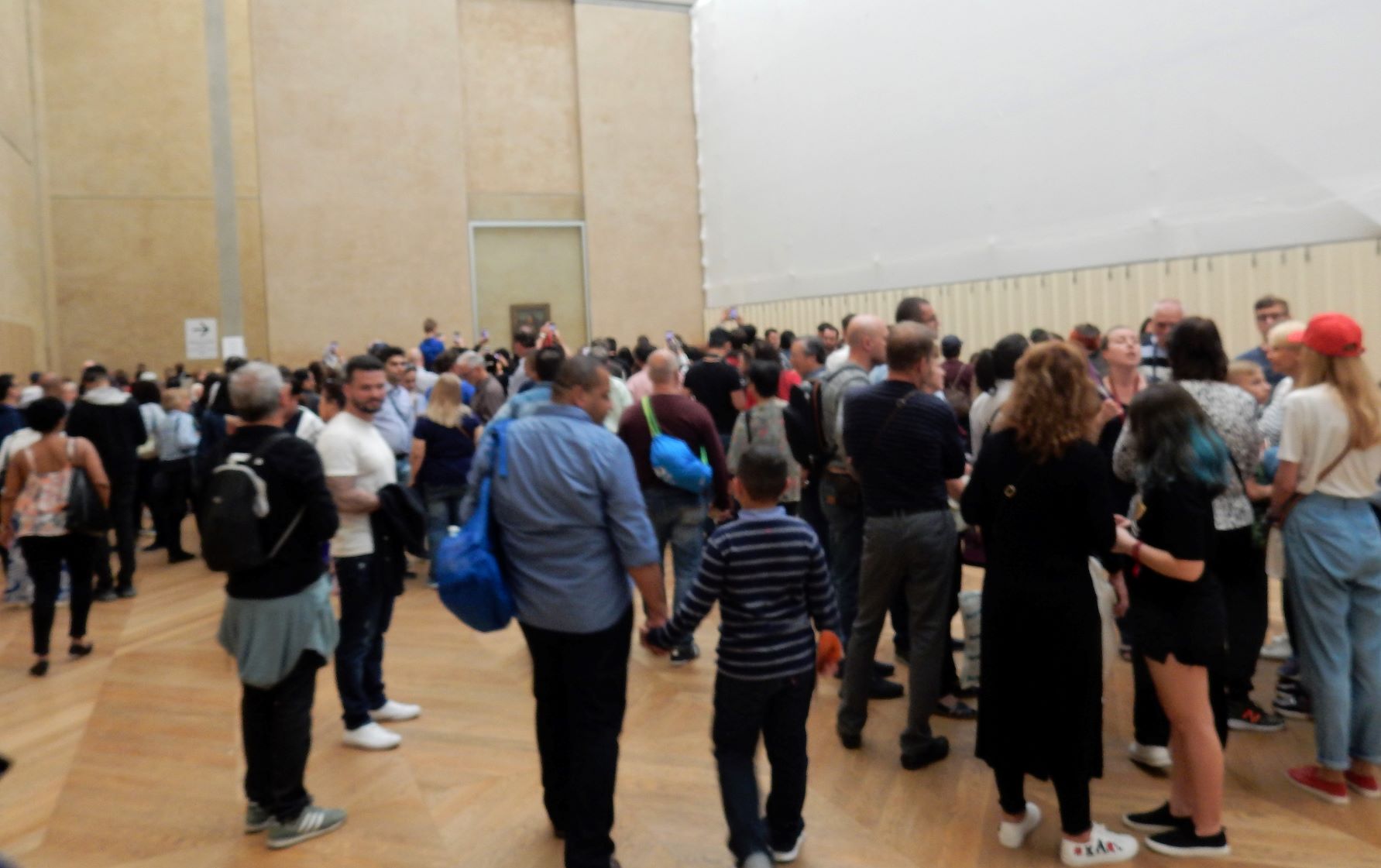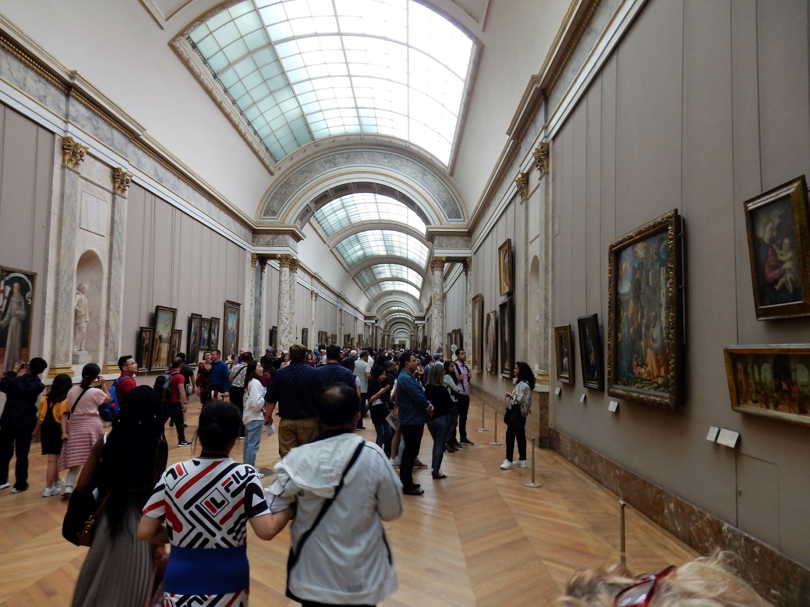 The museum display space is over 72,735 square meters (782,910 square feet). In 2018, the Louvre was the world’s most visited art museum, receiving 10.2 million visitors. OK, so lets think about that. That means there are a bunch every day. Hmmmm, they are closed 1 day a week, that’s 52 days a year, and they are closed on Christmas, so that’s 53. They may close other days, but I’m not going to research that deeply. 365 minus 53 = 312. 10,200,000 divided by 312 = 32,692. Well we know that’s not a balanced number, but so what. The museum is open from 9:00 to 6:00 4 days a week and add 3:45 two days, so let’s just say its open 10 hours a day. So 3,269 people flow through the door every hour its open. That’s 54.5 people every minute. And they are all headed for the Mona Lisa!