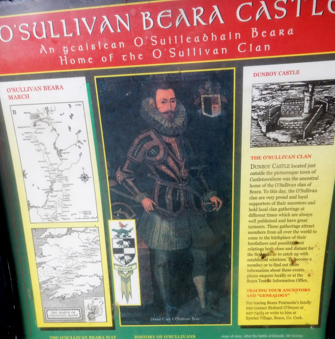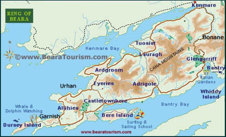 This area was home to the O’Sullivan Bere clan. Here you will find the ruins of Dunboy O’Sullivan/Beara castle, look at the pics and other historical sites as well as the fishing town of Castletownberehaven. If you have the time, ferries run over to the hillwalker’s paradise of Bere Island.