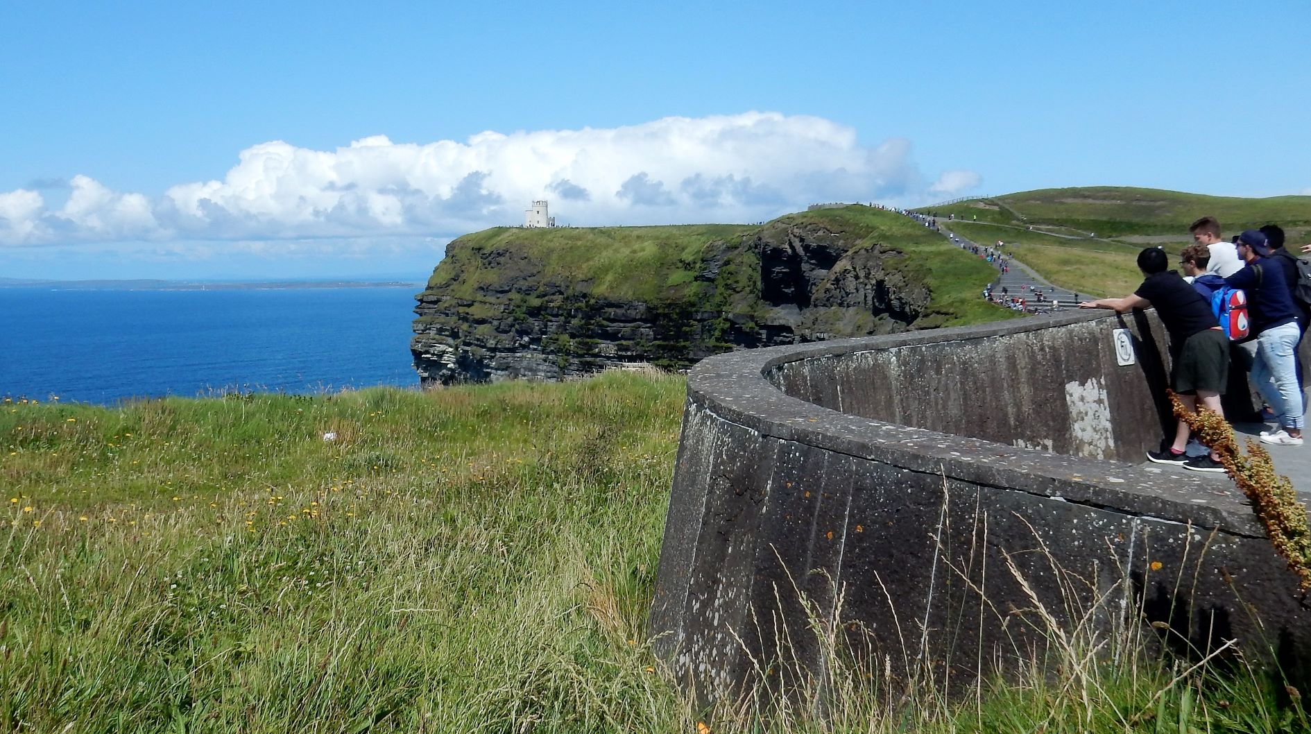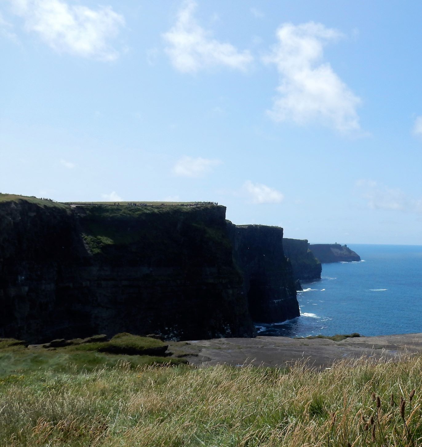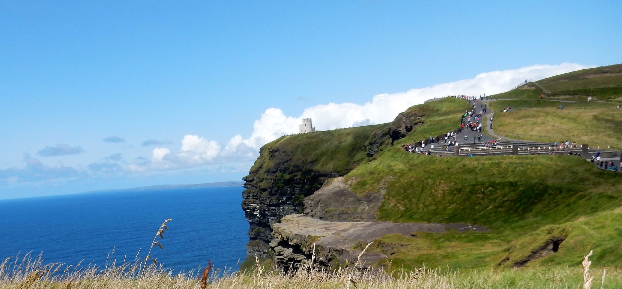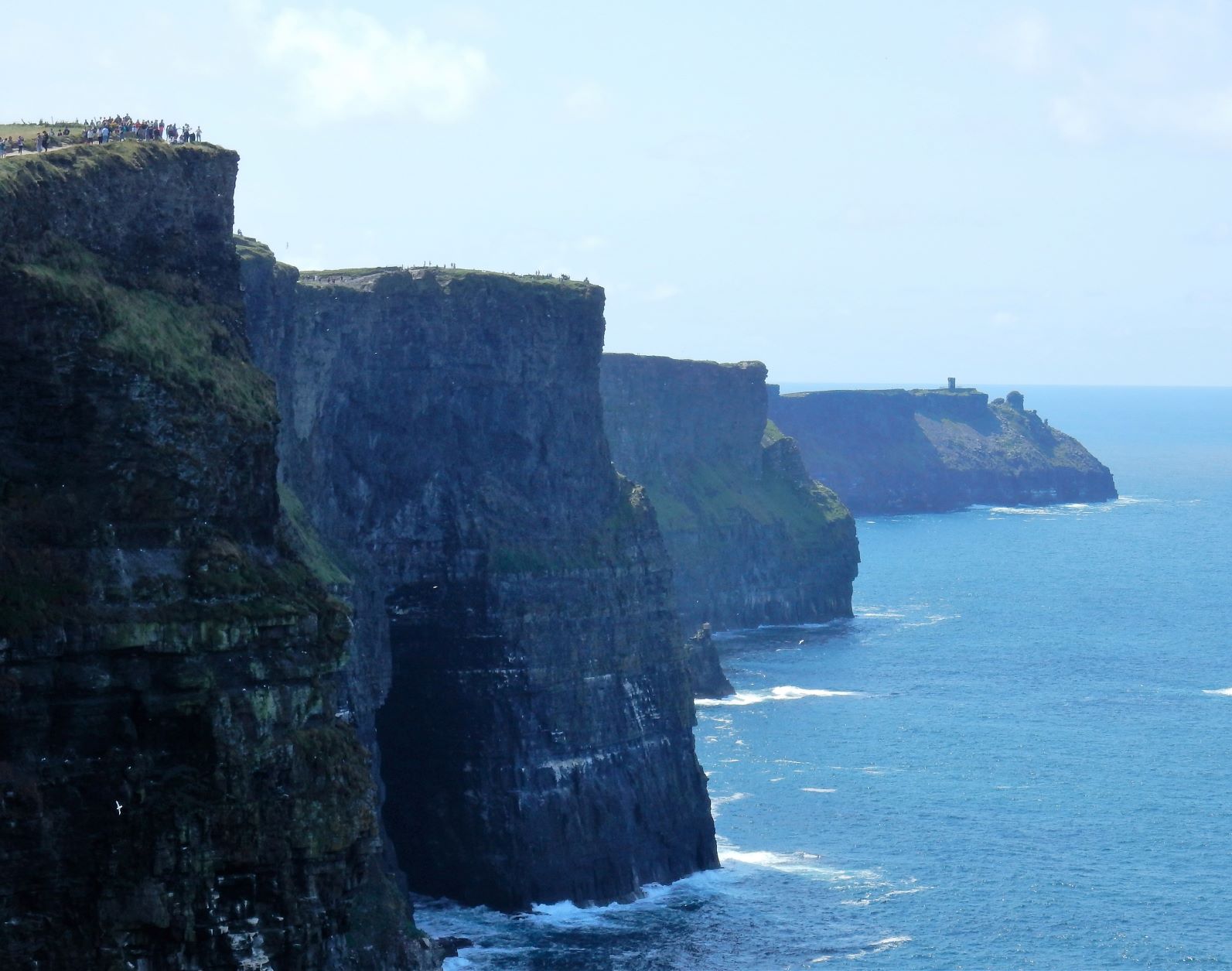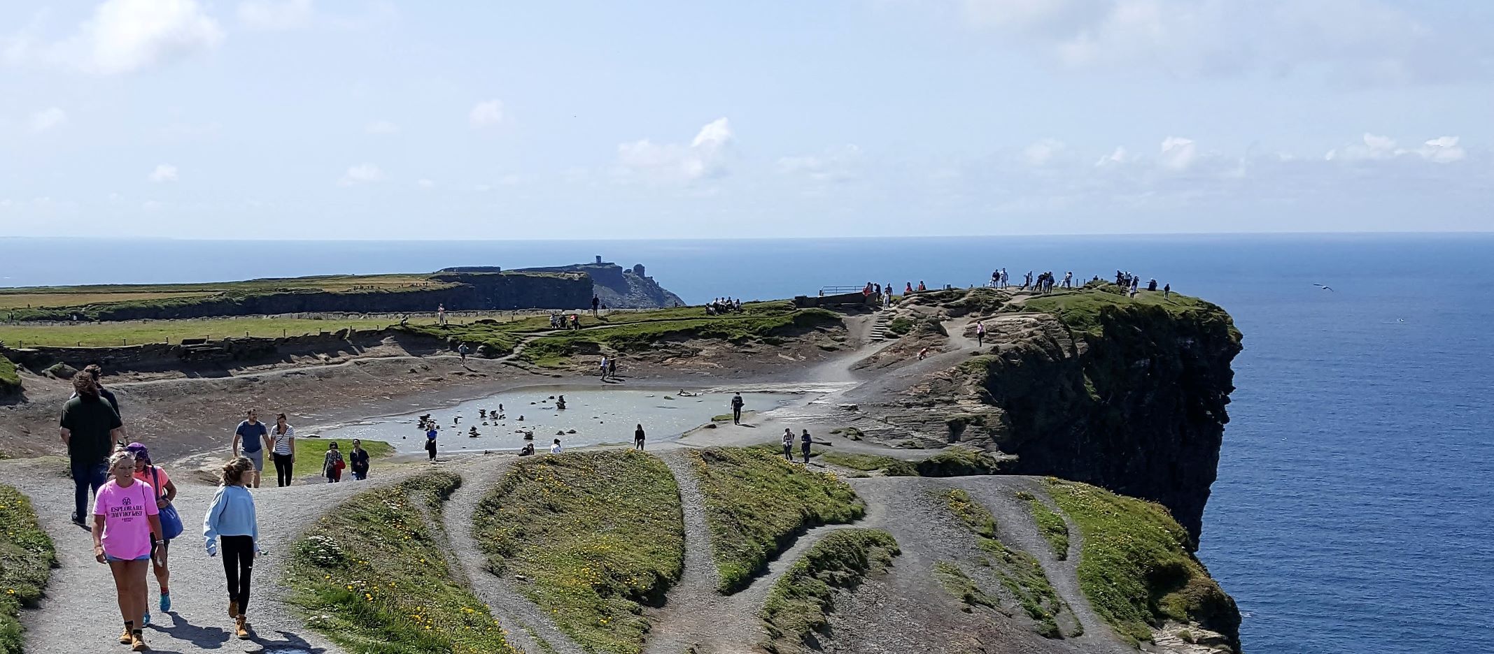 From the cliffs, you can see the Aran Islands, the Maumturks and Twelve Pins mountain ranges to the north in County Galway, and Loop Head to the south. The tourist department claims the cliffs rank among the most visited tourist sites in Ireland, with around 1.5 million visits per year. I think most of them were there on the Saturday we visited.