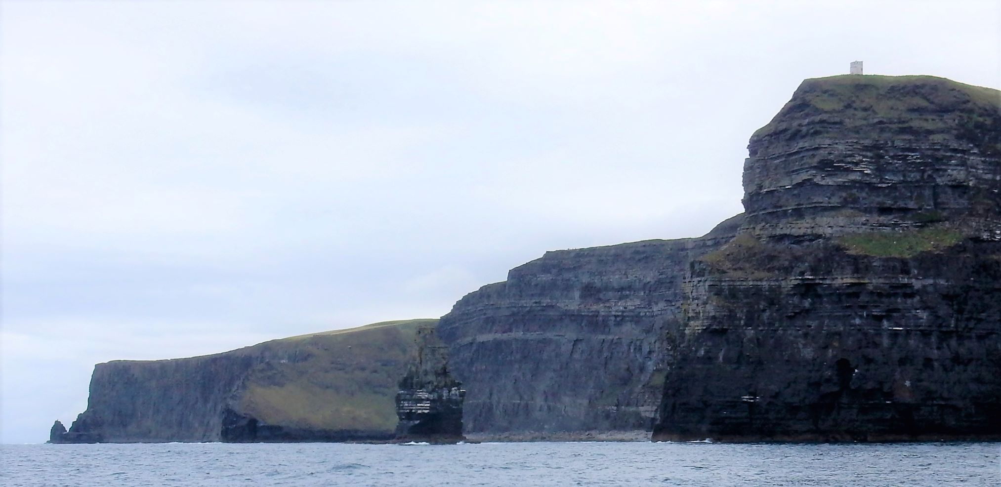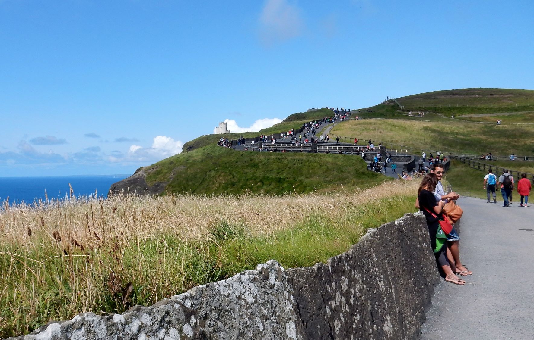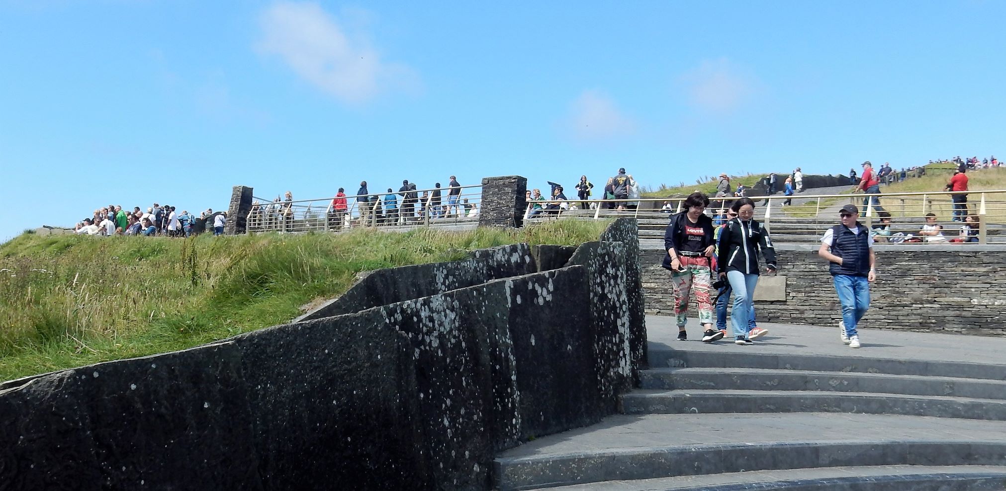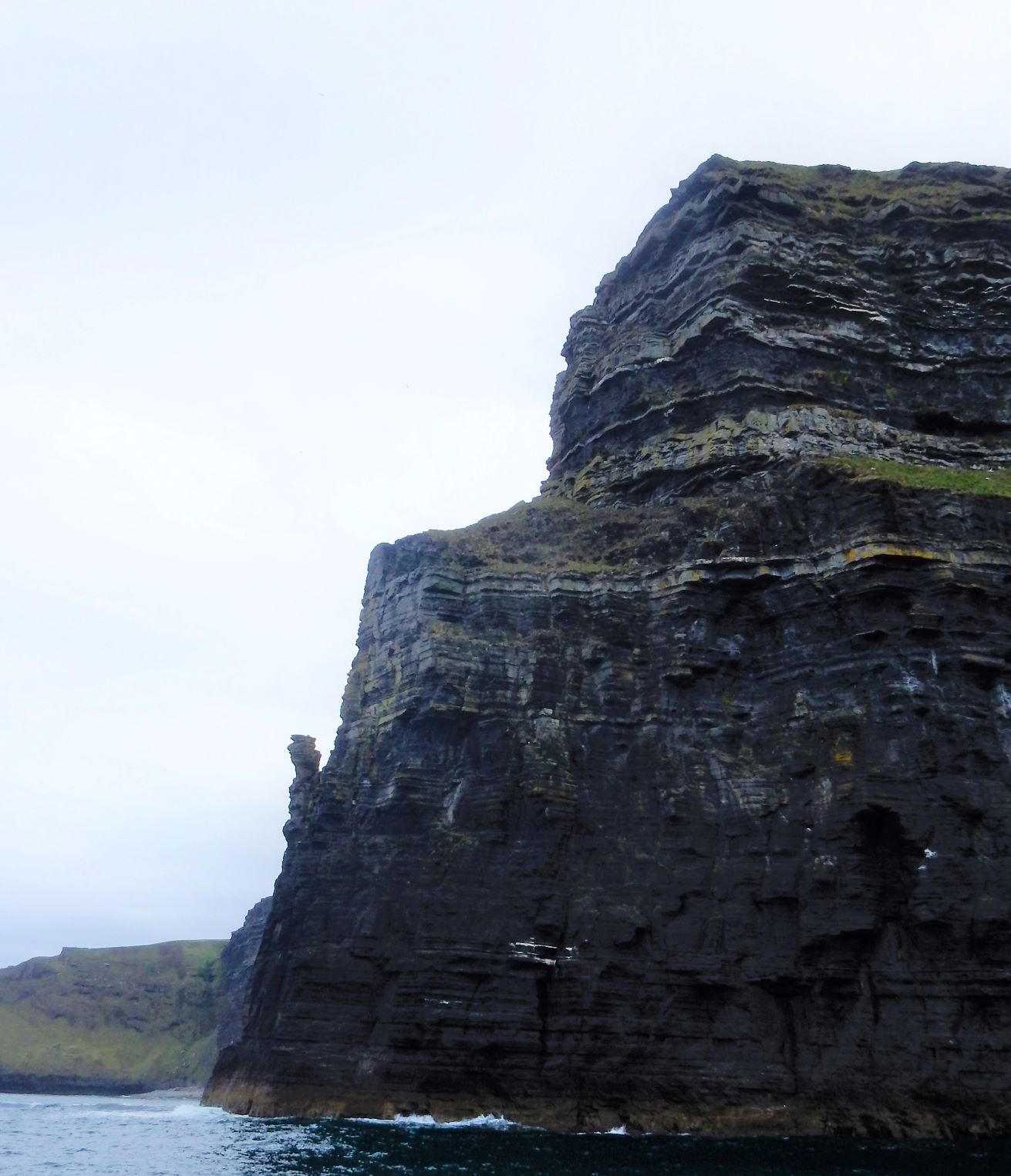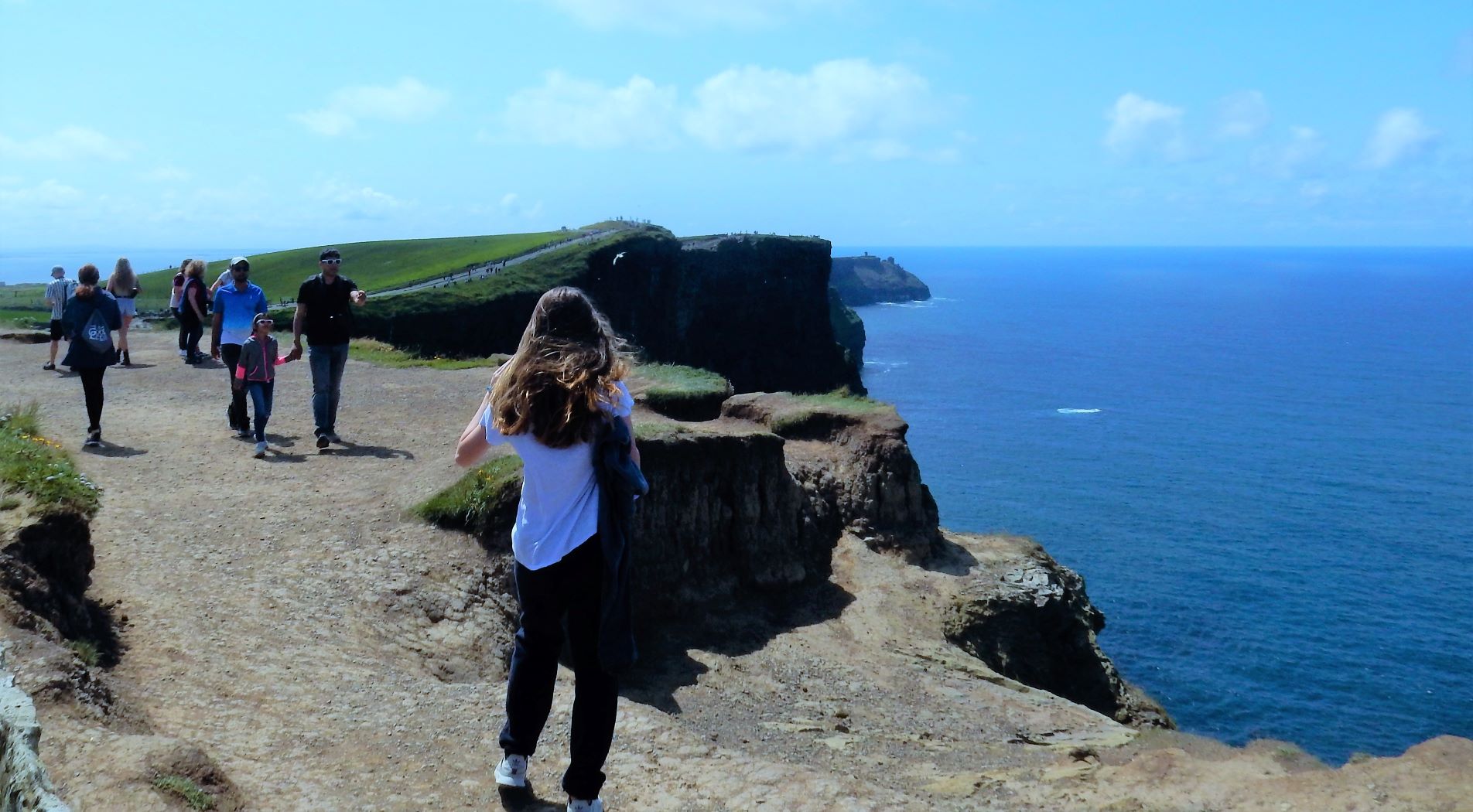 From the cliffs, you can see the Aran Islands, the Maumturks and Twelve Pins mountain ranges to the north in County Galway, and Loop Head to the south. The tourist department claims the cliffs rank among the most visited tourist sites in Ireland, with around 1.5 million visits per year. I think most of them were there on the Saturday we visited.