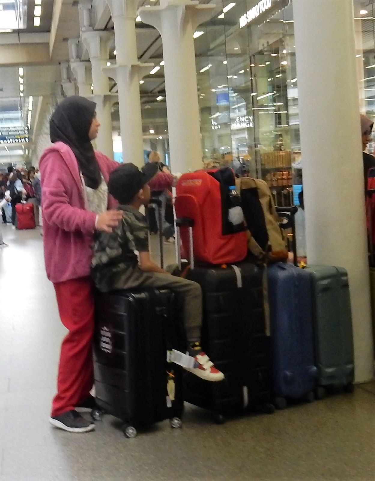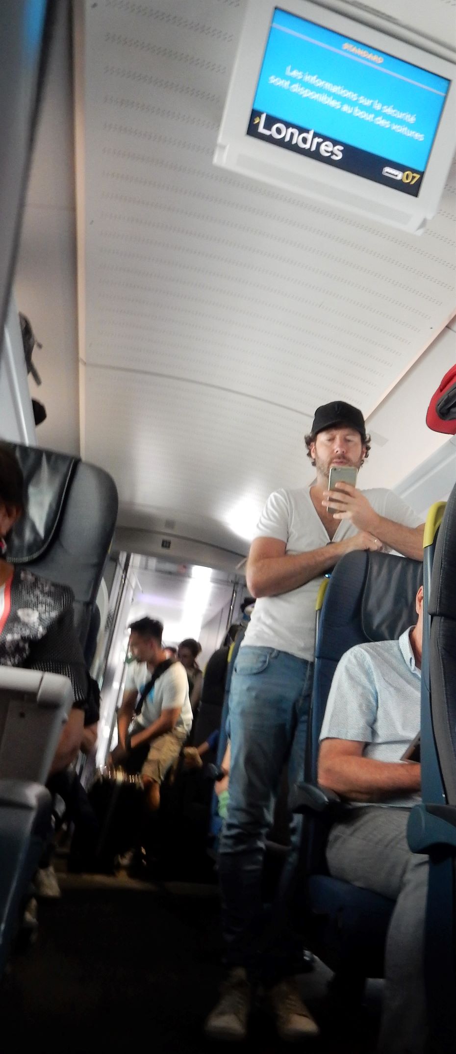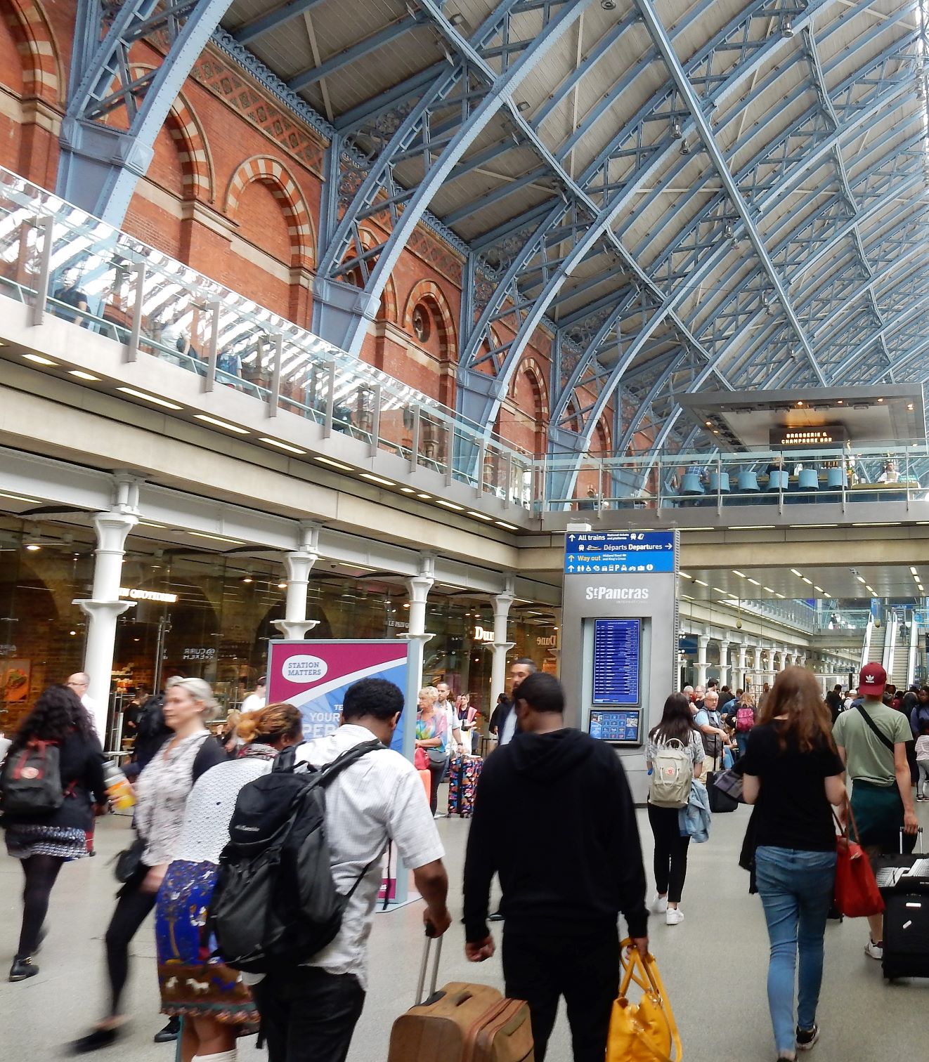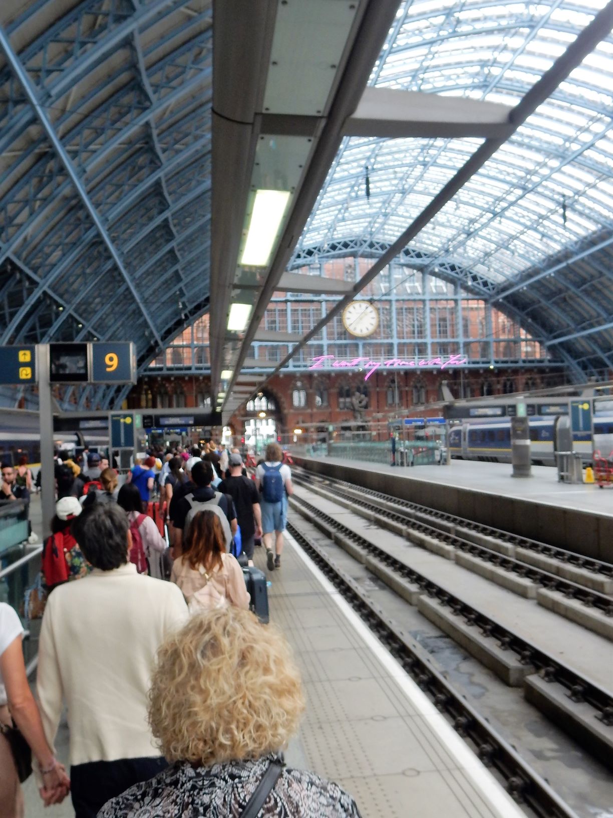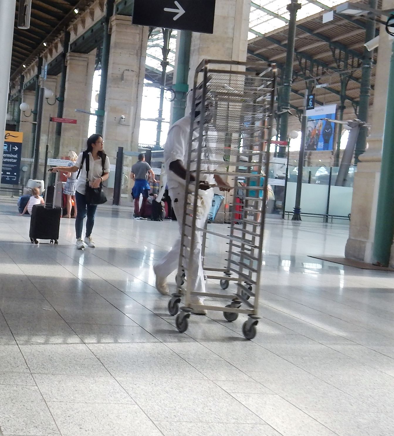 We arrived early (2 hours) at Gare du Nord for our trip from our crummy Paris hotel and had time to get breakfast and people watch before heading up to the Eurostar platform. There was no AC in the terminal, and Europe was caught in the midst of an unexpected heat wave, so it was stifling inside, but we can suffer as well as the next traveler when subjected to this inconvenience.